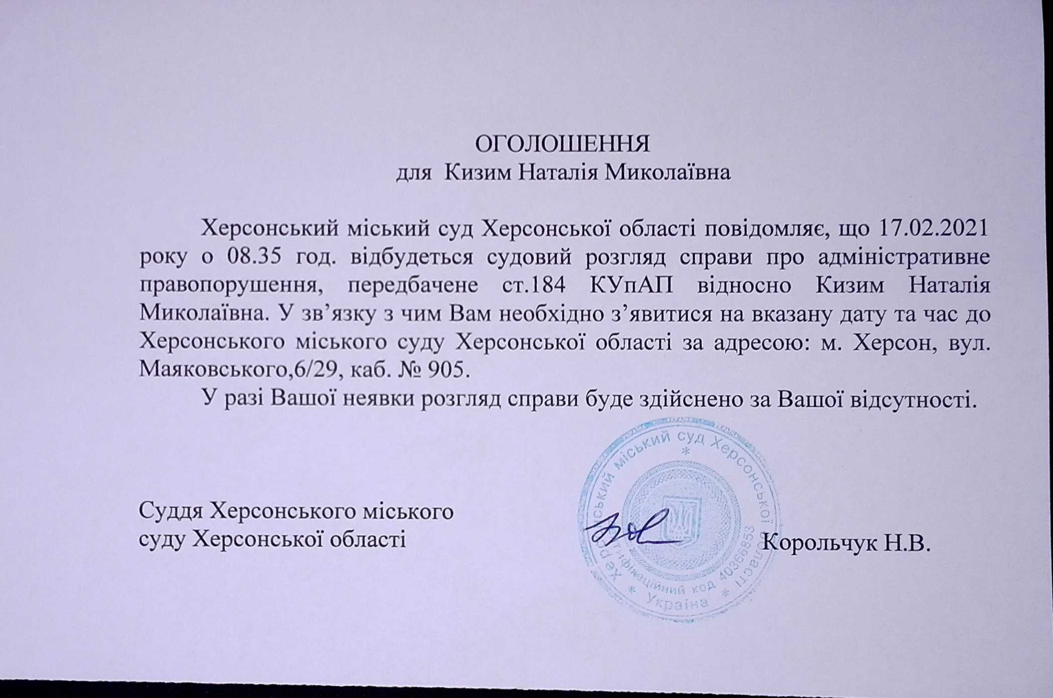 ОГОЛОШЕННЯ для Кизим Наталії Миколаївни