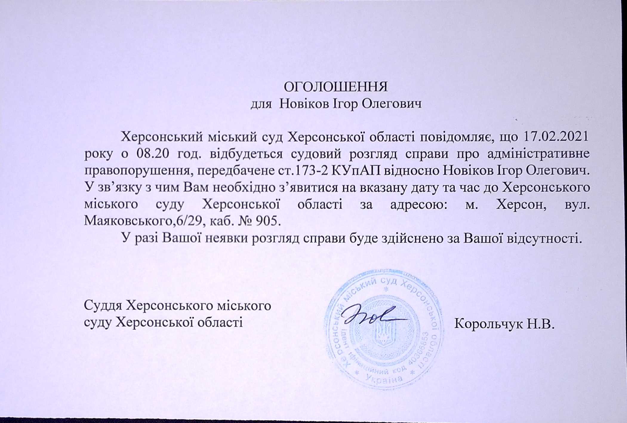 ОГОЛОШЕННЯ для Новікова Ігоря Олеговича