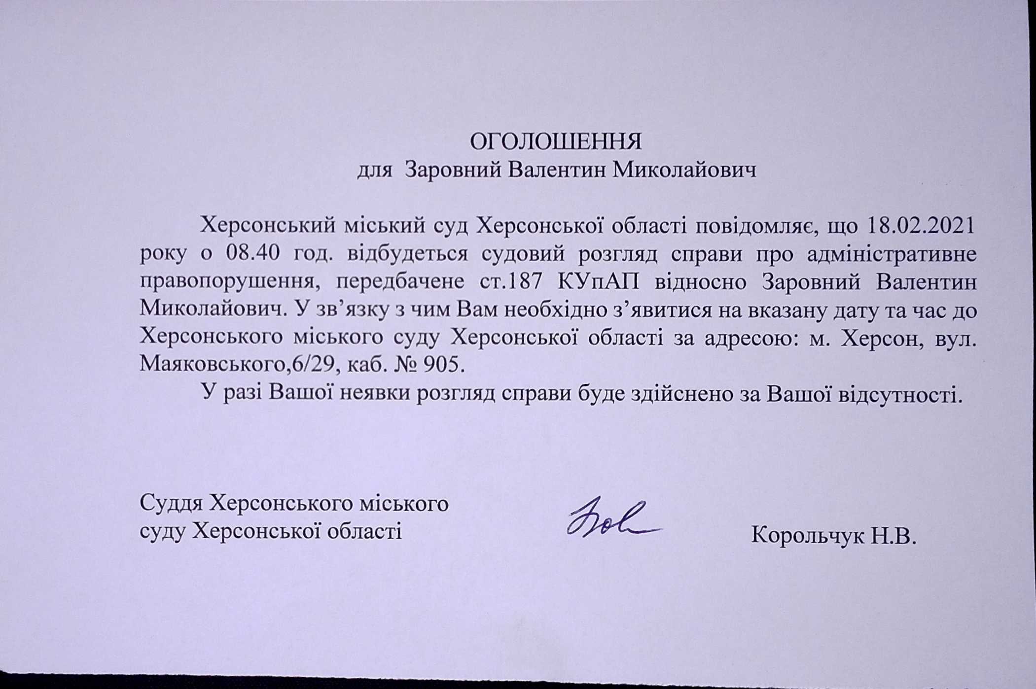 ОГОЛОШЕННЯ для Заровного Валентина Миколайовича