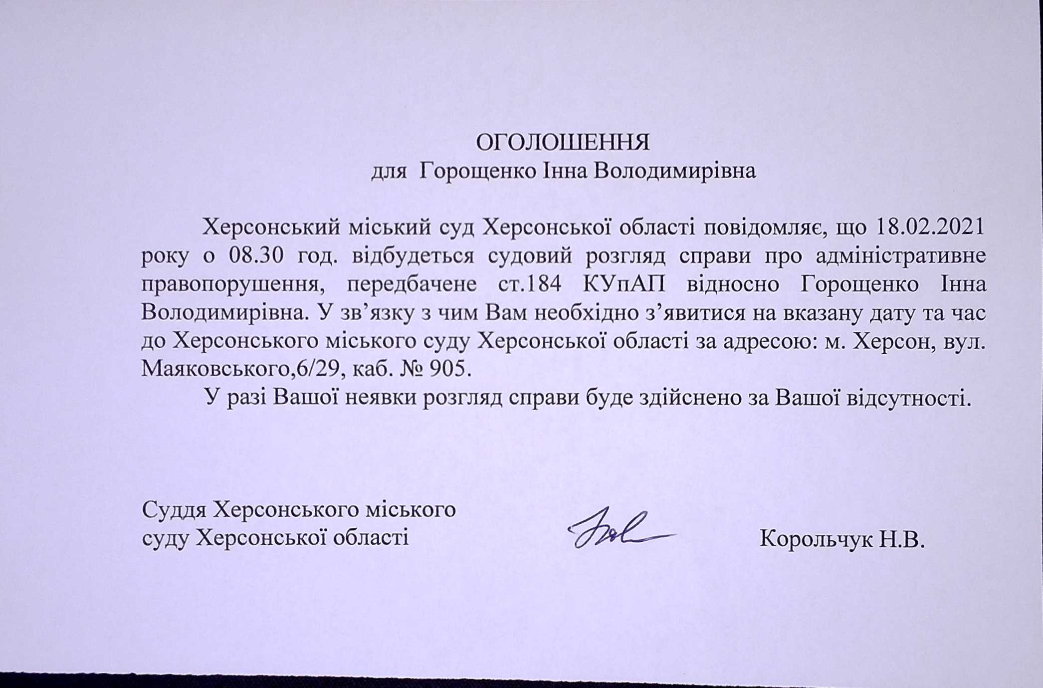 ОГОЛОШЕННЯ ПРО ВИКЛИК ДО СУДУ