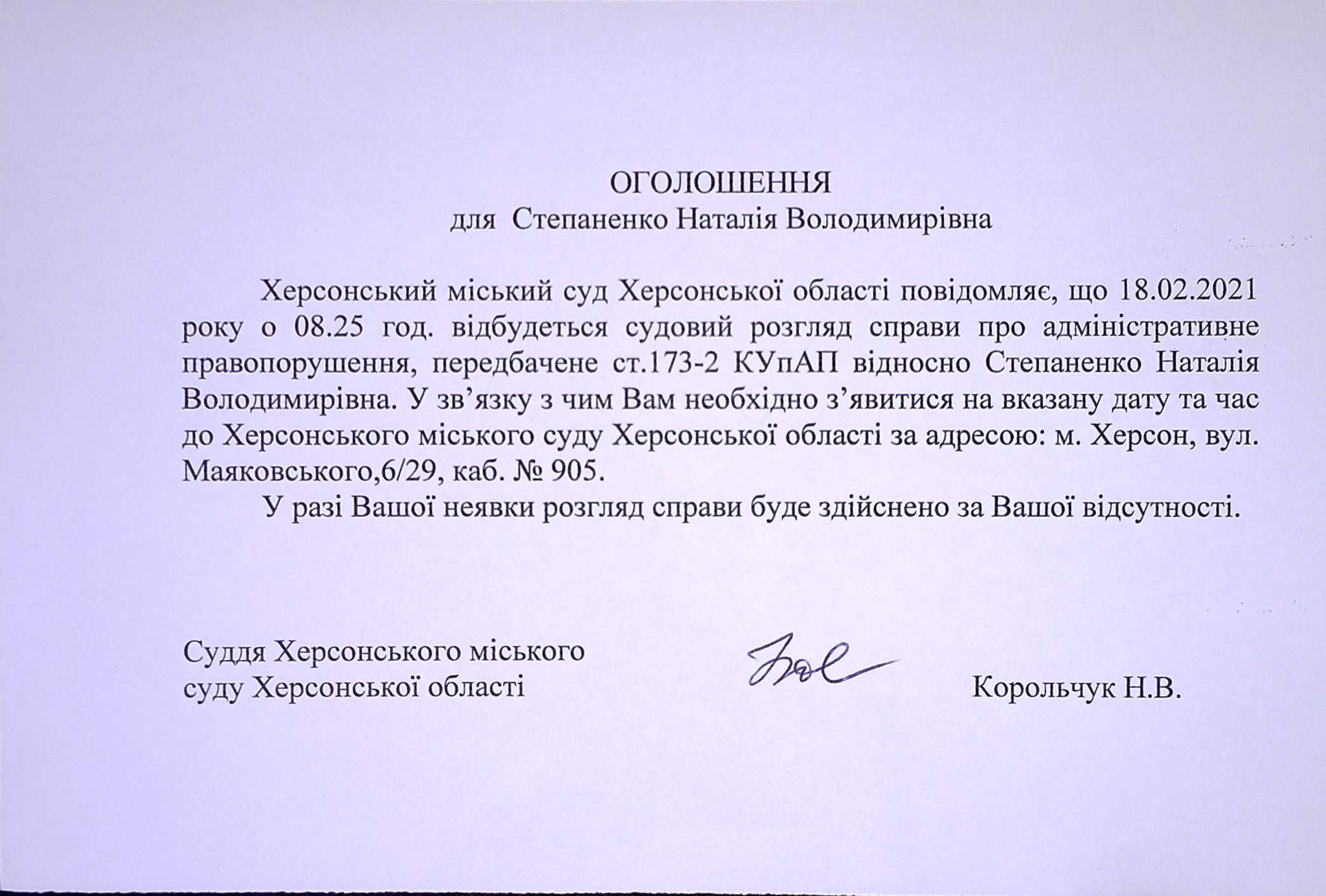 ОГОЛОШЕННЯ для Степаненко Наталії Володимирівни