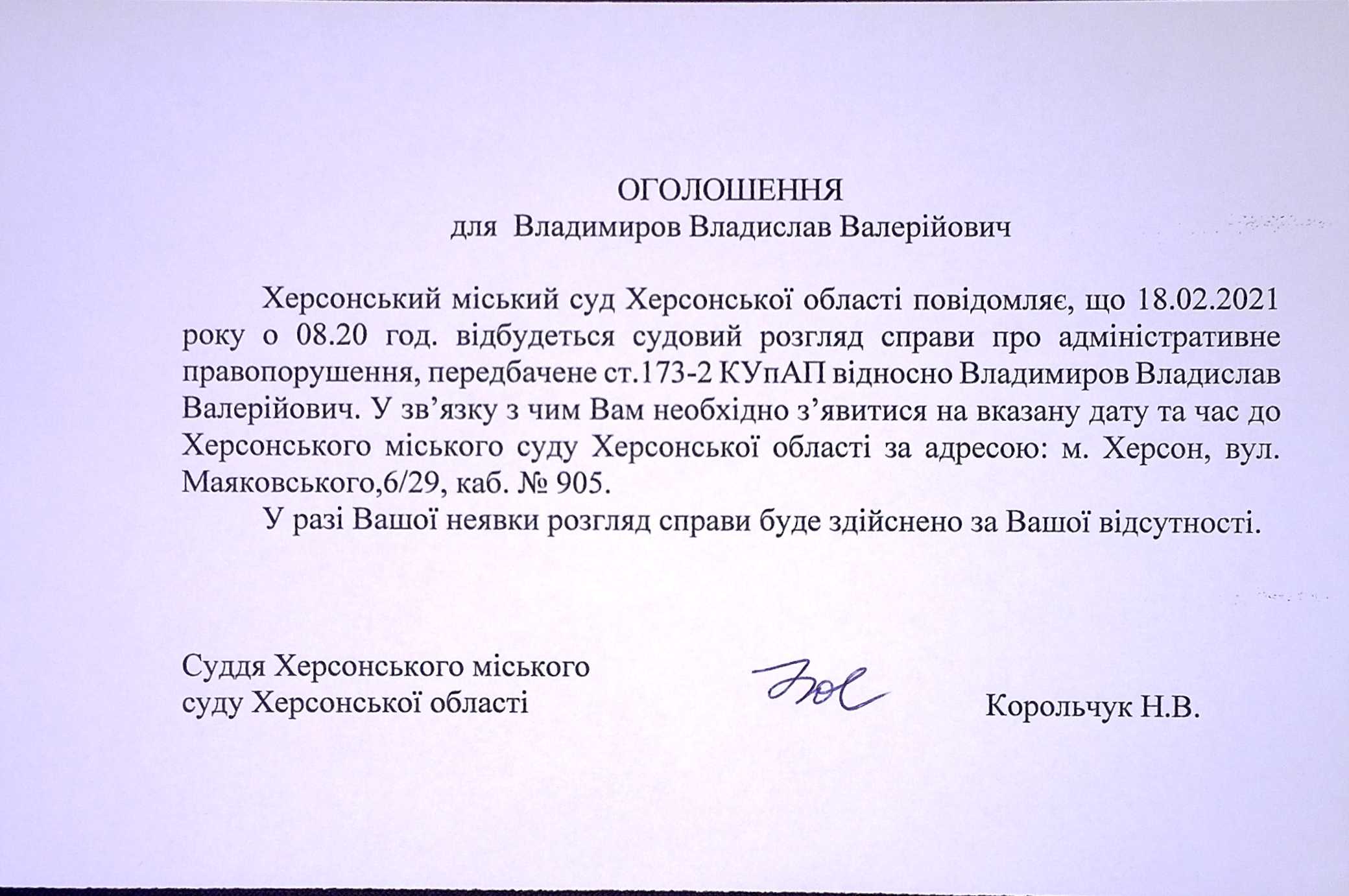 ОГОЛОШЕННЯ для Владимирова Владислава Валерійовича