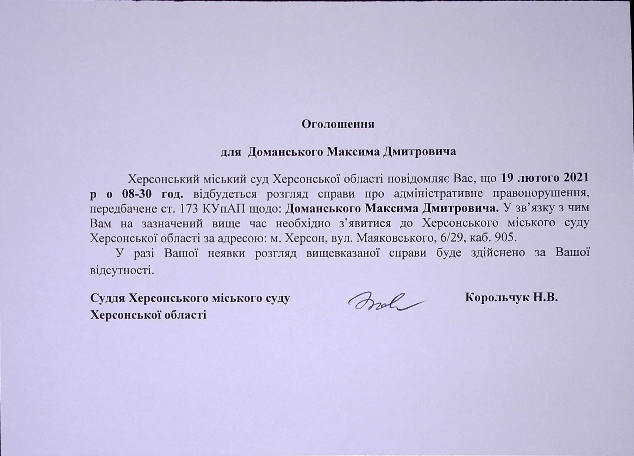 ОГОЛОШЕННЯ для Доманського Максима Дмитровича