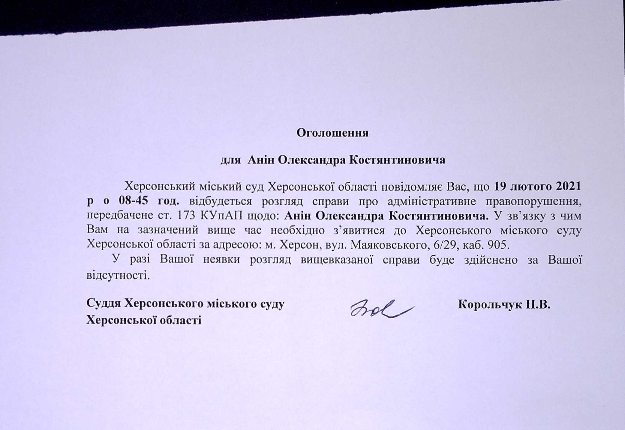 ОГОЛОШЕННЯ для Аніна Олександра Костянтиновича