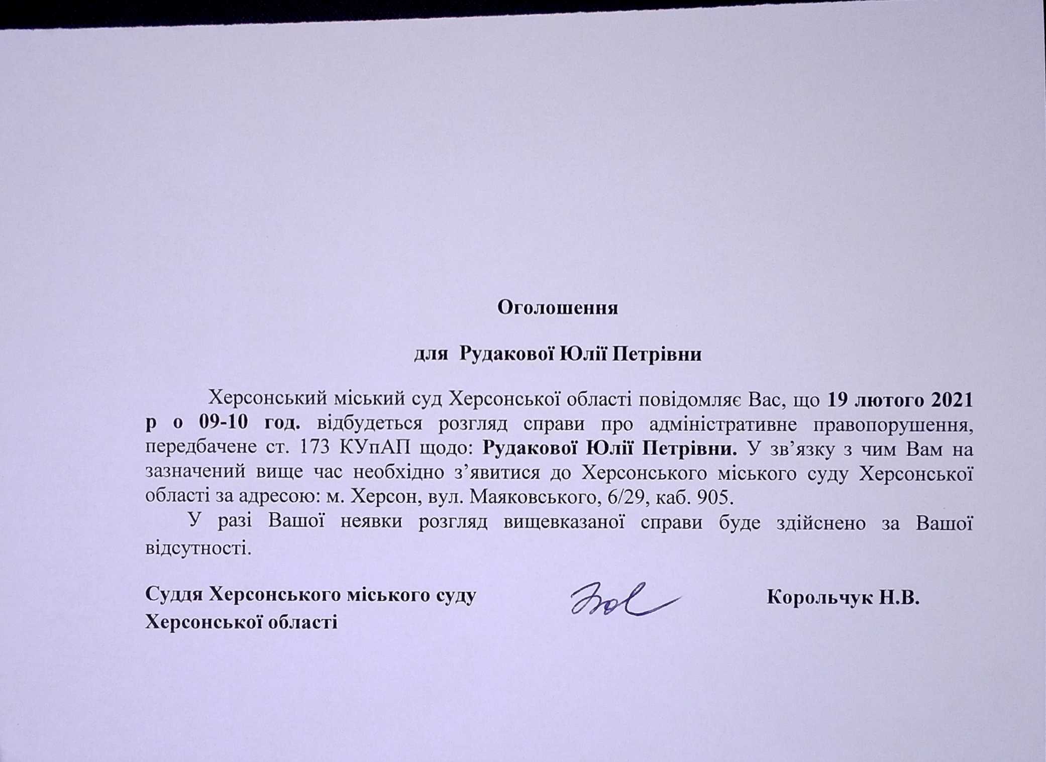 ОГОЛОШЕННЯ для Рудакової Юлії Петрівни