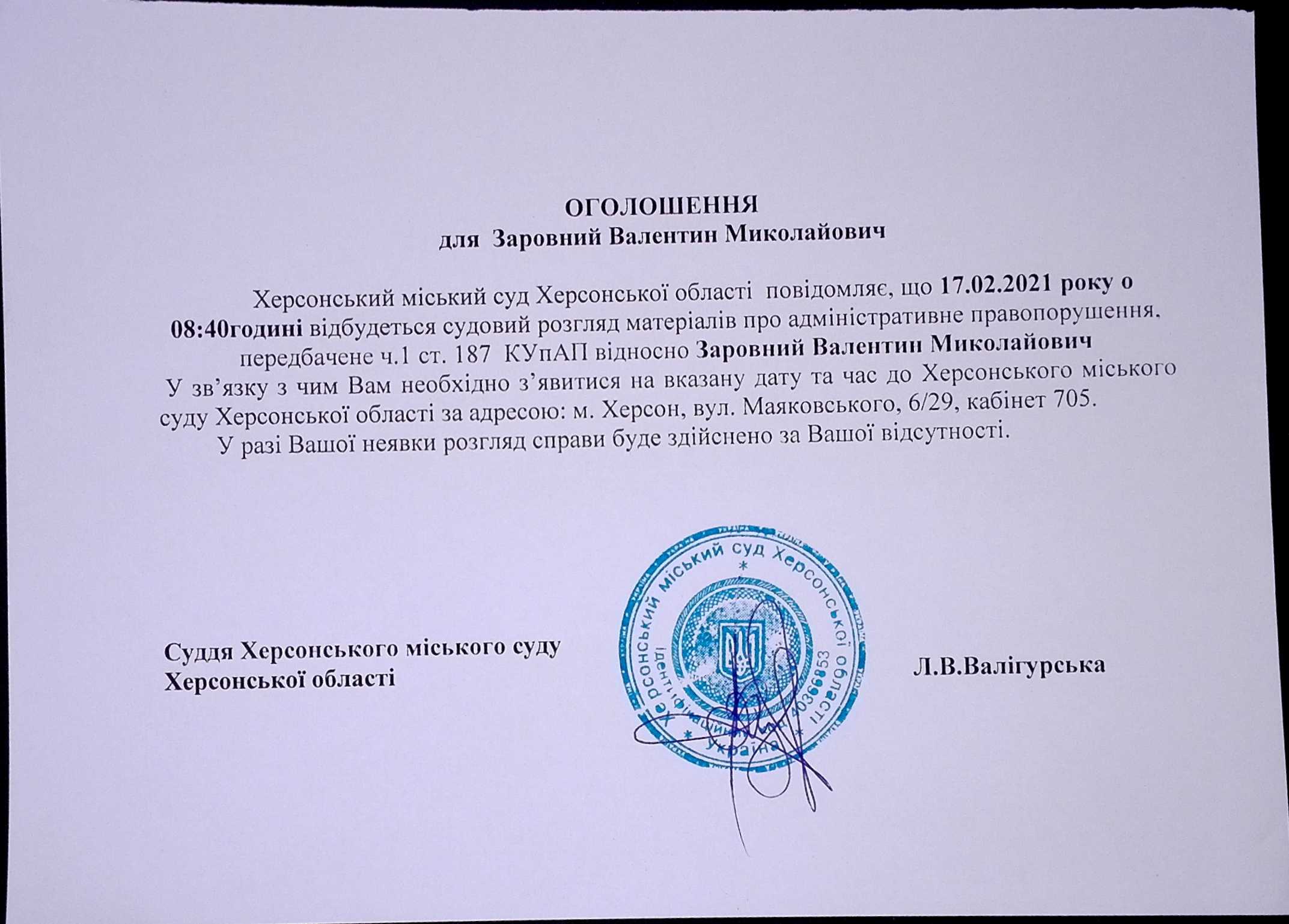 ОГОЛОШЕННЯ для Заровний Валентин Миколайовича