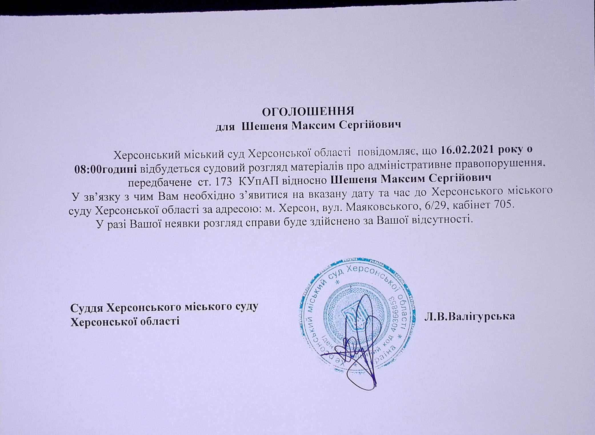 ОГОЛОШЕННЯ для Шешені Максима Сергійовича