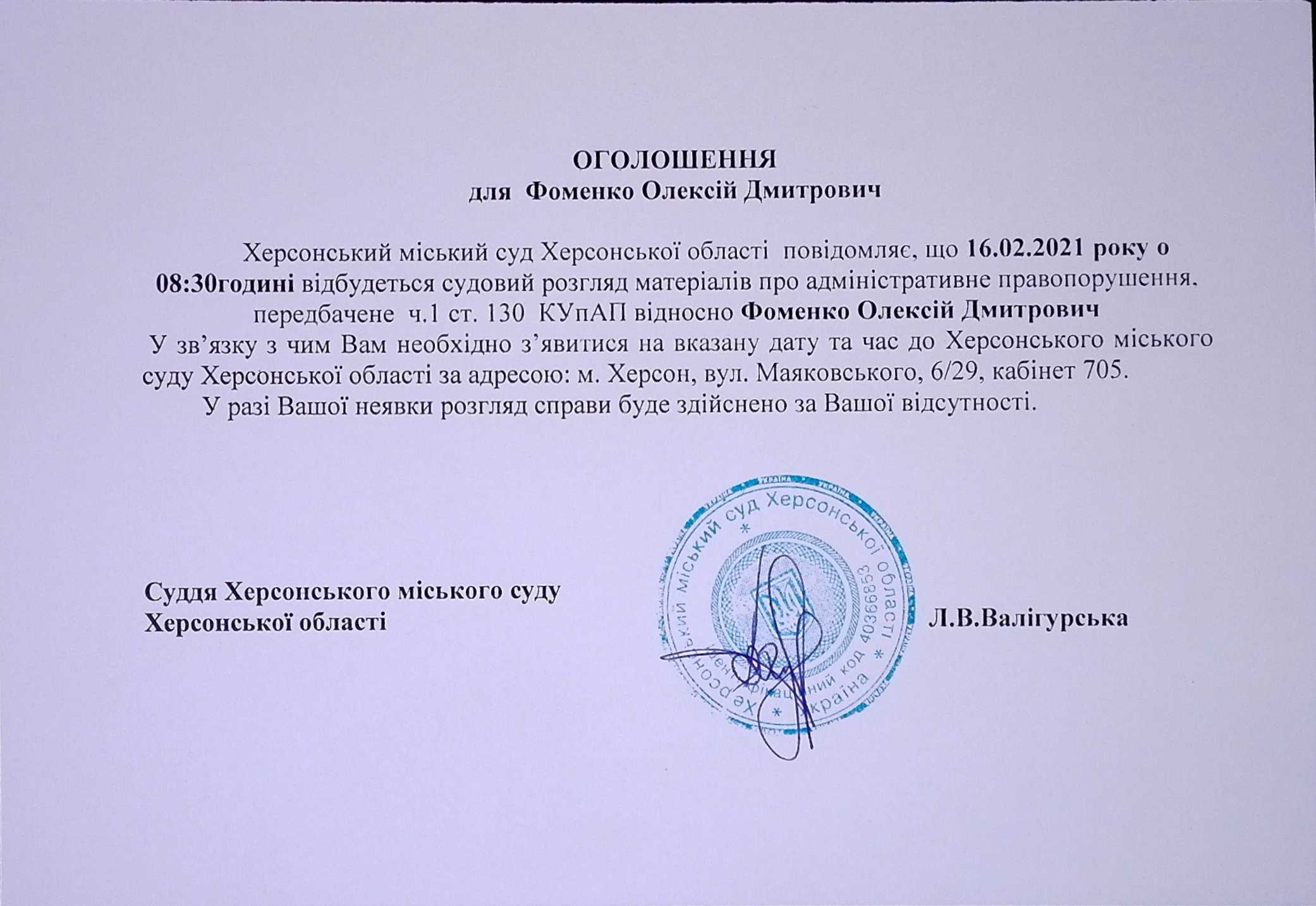 ОГОЛОШЕННЯ для Фоменко Олексія Дмитровича