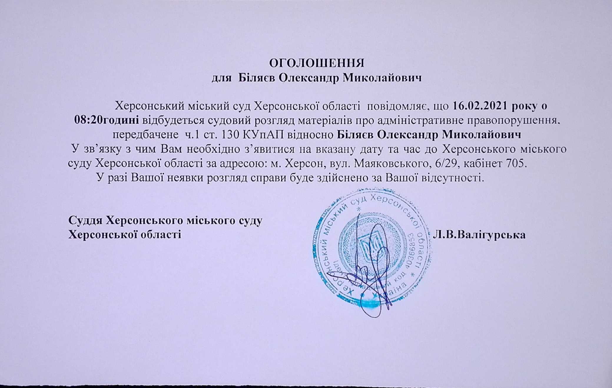 ОГОЛОШЕННЯ для Біляєва Олександра Миколайовича