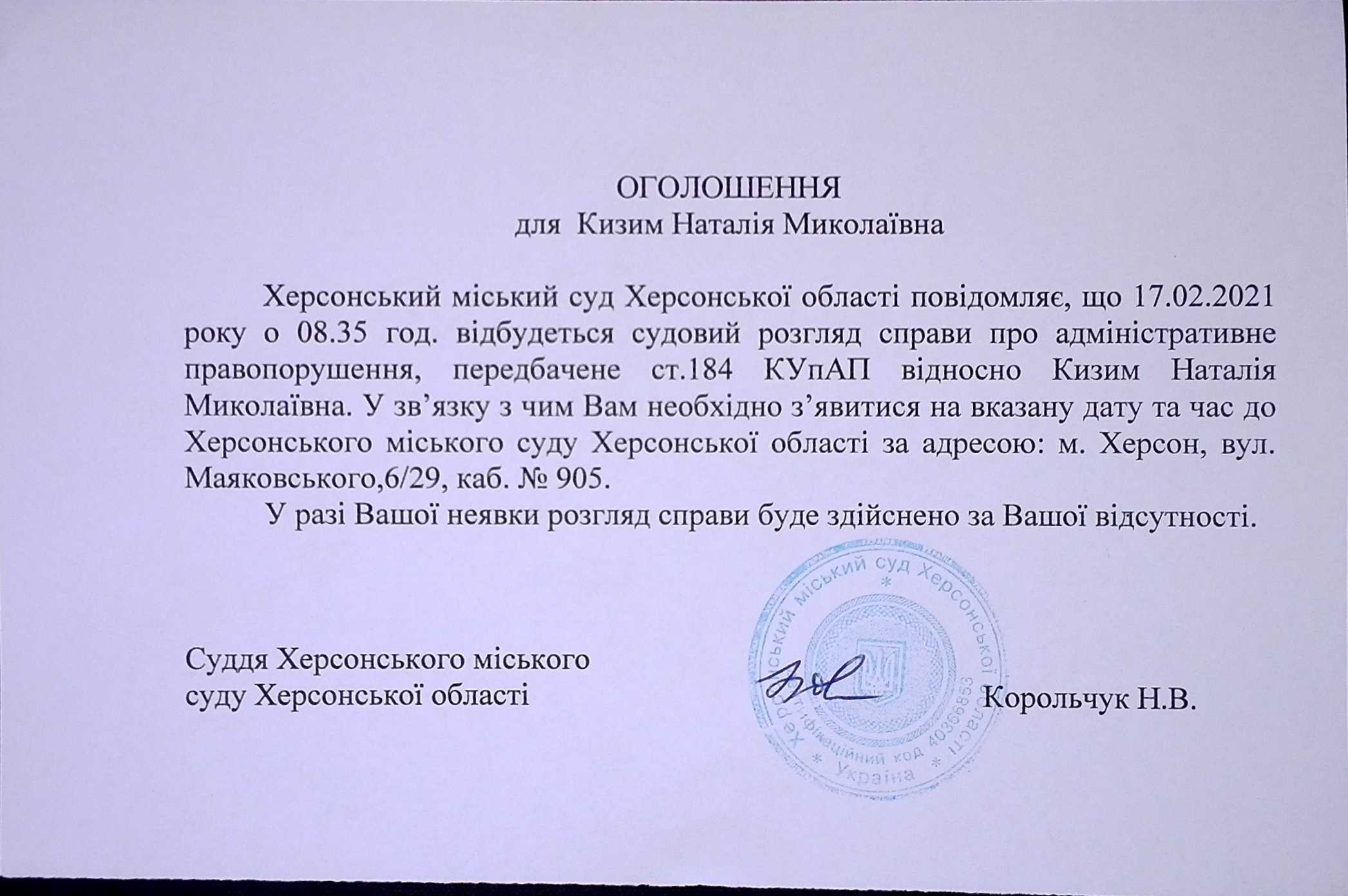 ОГОЛОШЕННЯ для Кизим Наталії Миколаївни