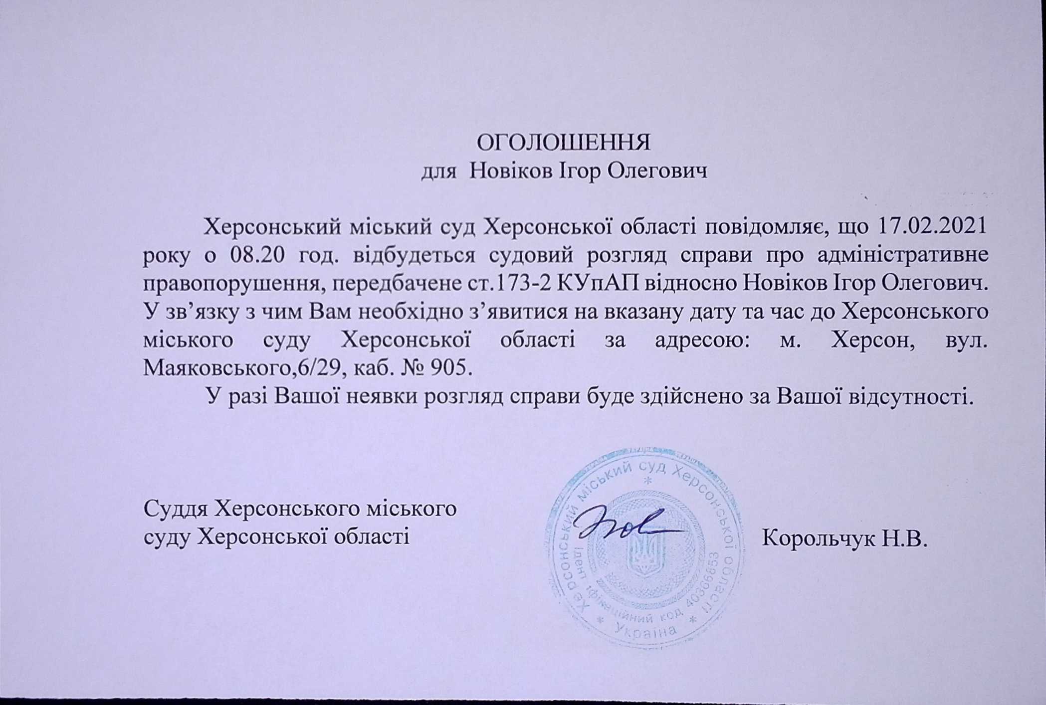 ОГОЛОШЕННЯ для Новікова Ігоря Олеговича