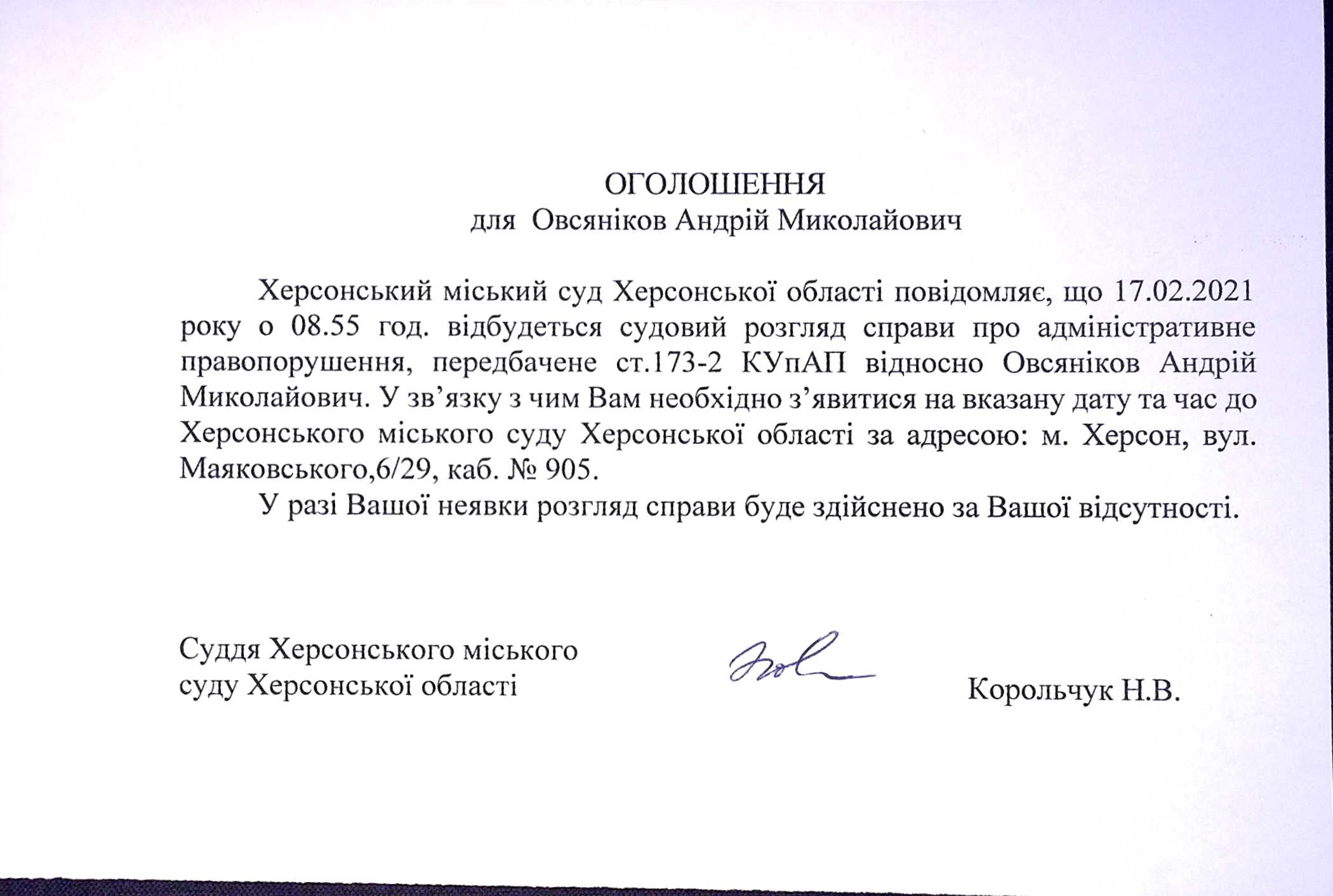 ОГОЛОШЕННЯ для Овсяннікова Андрія Миколайовича