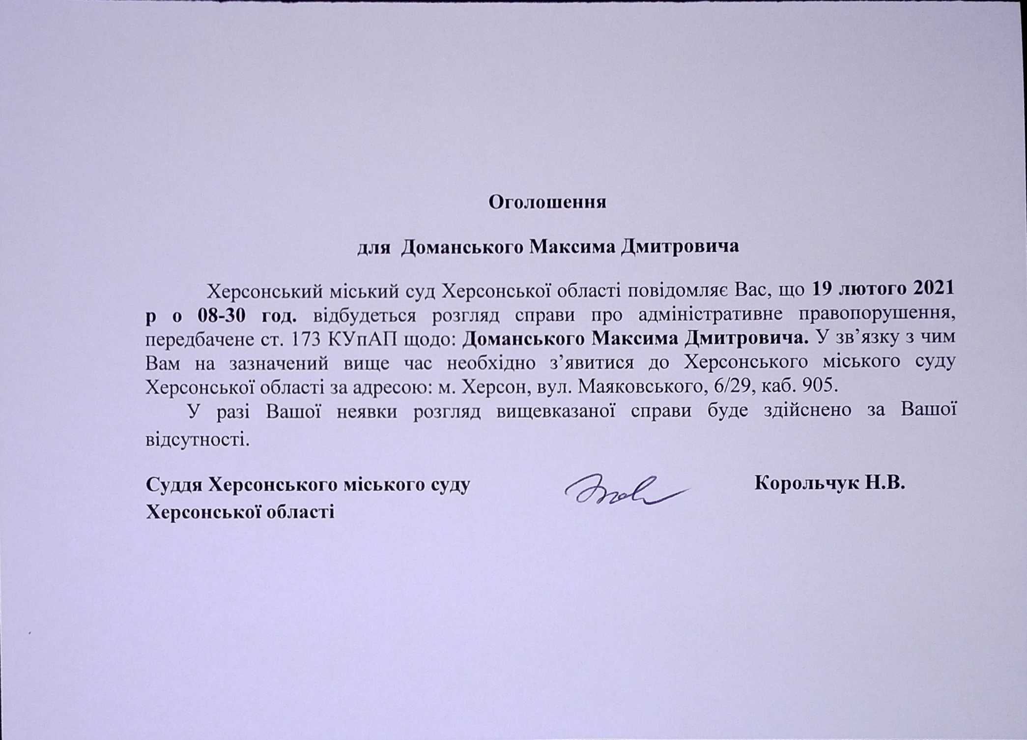 ОГОЛОШЕННЯ для Доманського Максима Дмитровича