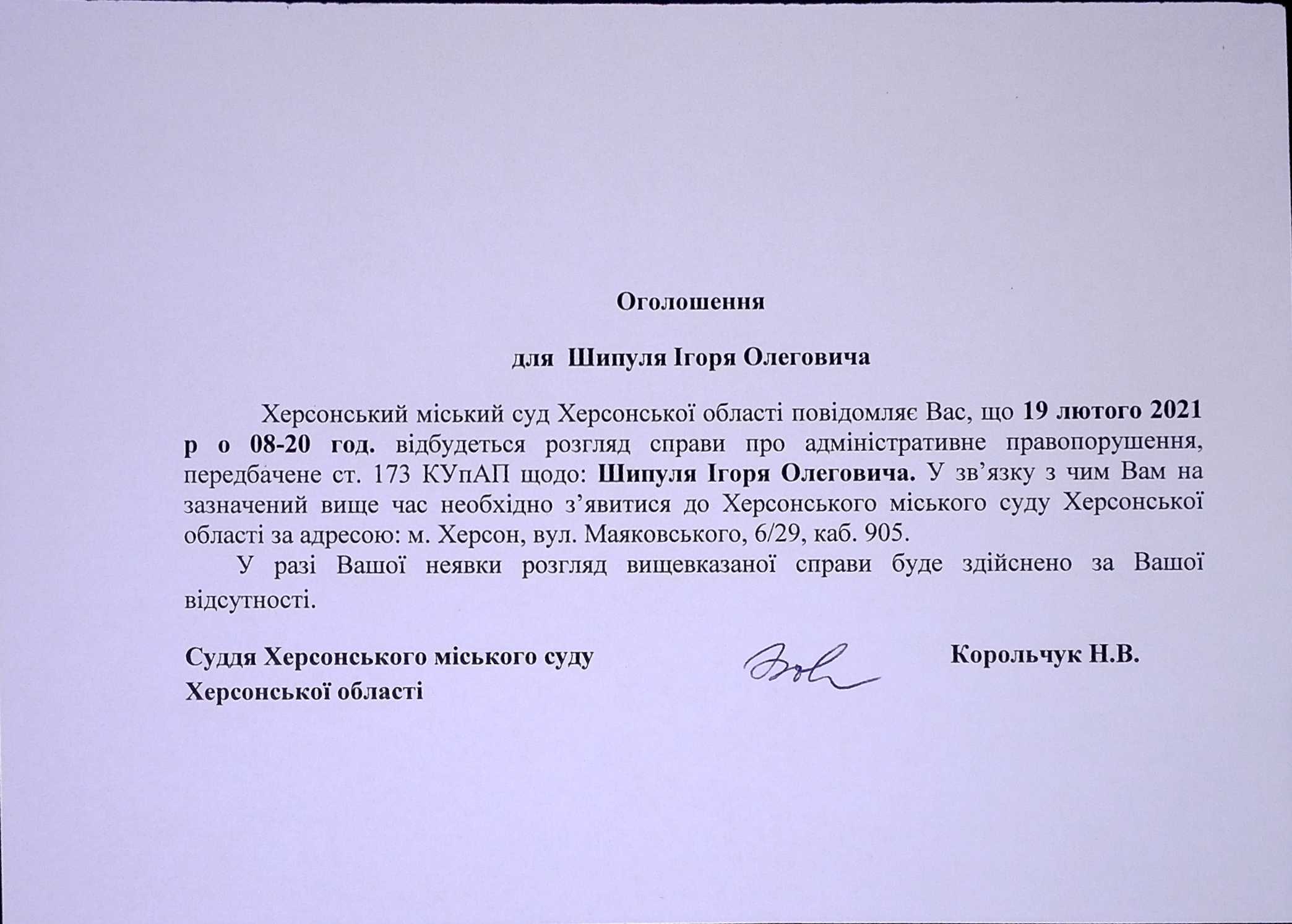 ОГОЛОШЕННЯ для Шипулі Ігоря Олеговича