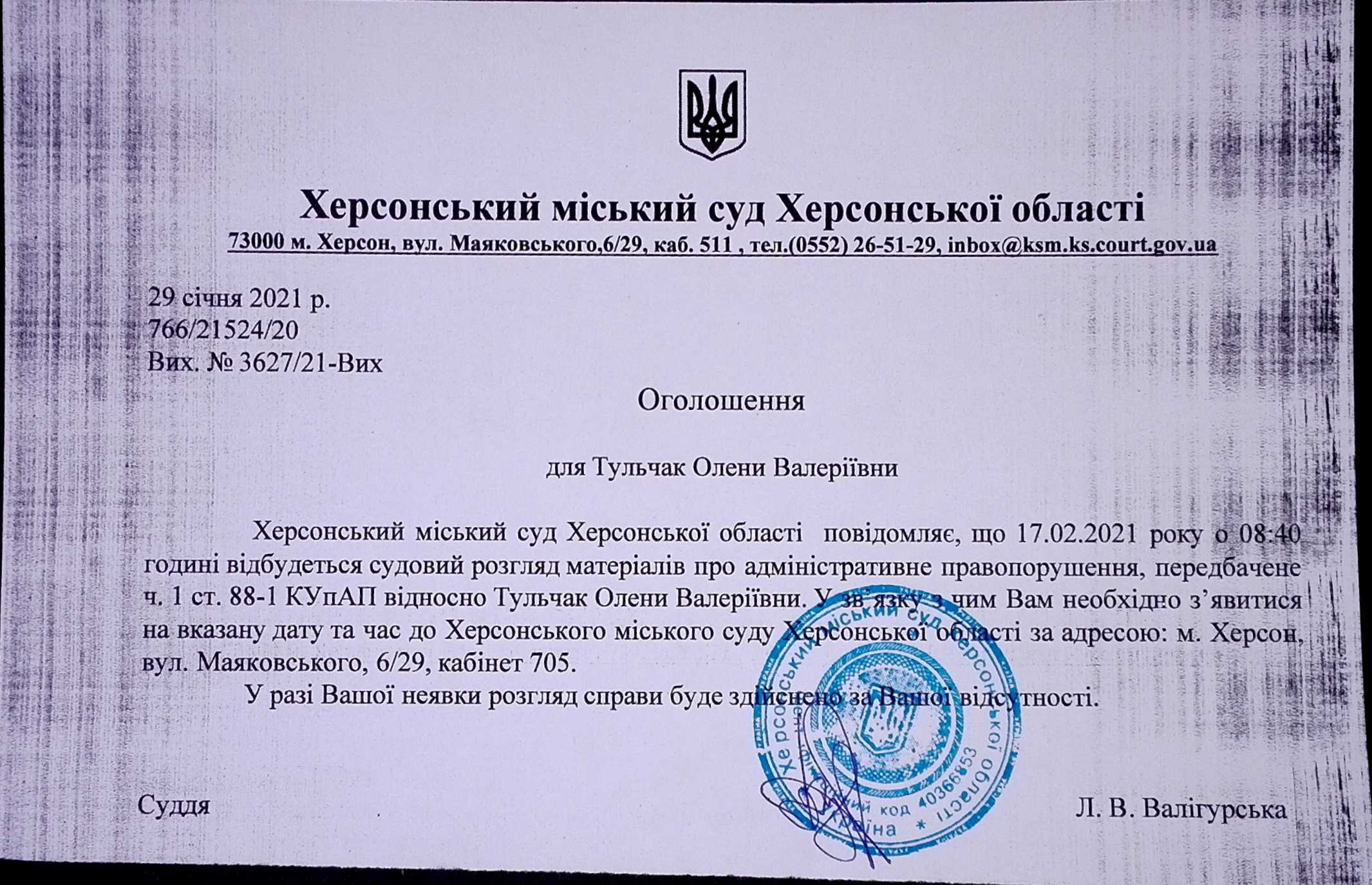 ОГОЛОШЕННЯ для Тульчак Олени Валеріївни