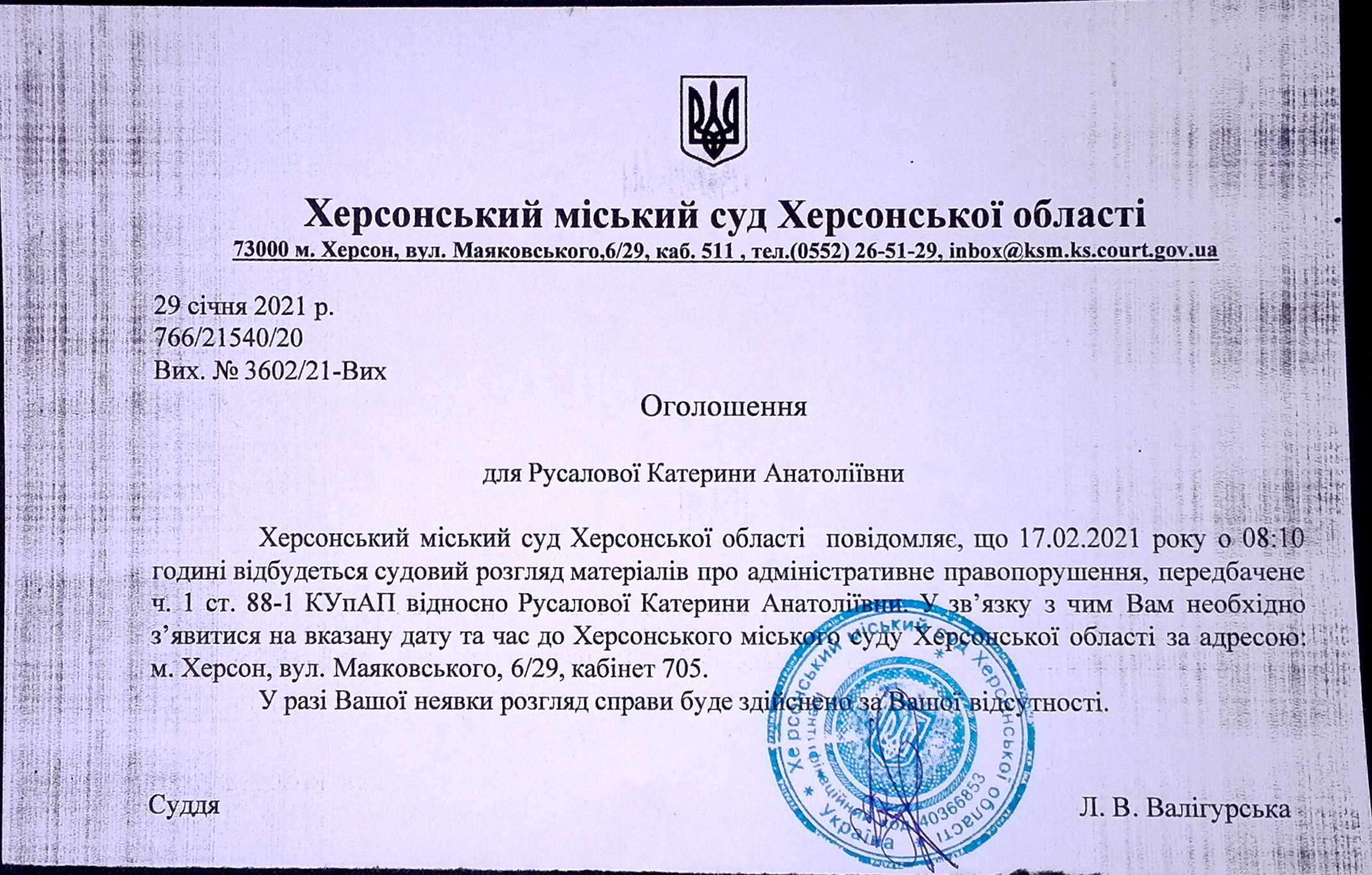 ОГОЛОШЕННЯ для Русалової Катерини Анатоліївни
