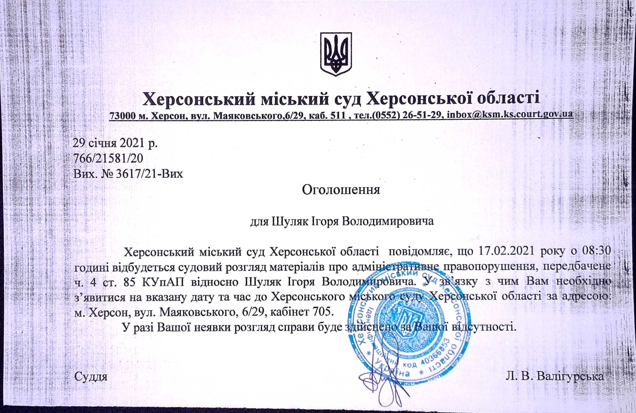 ОГОЛОШЕННЯ ПРО ВИКЛИК ДО СУДУ