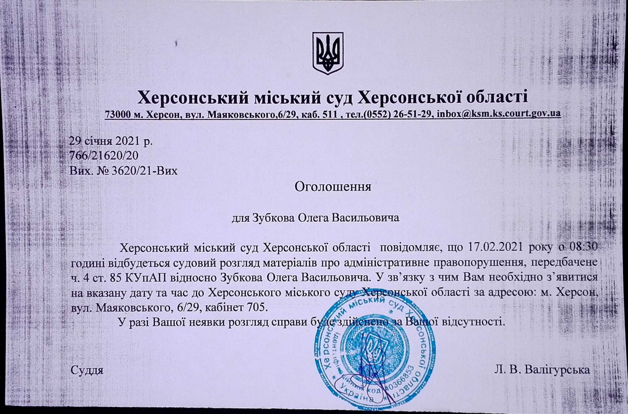 ОГОЛОШЕННЯ ПРО ВИКЛИК ДО СУДУ