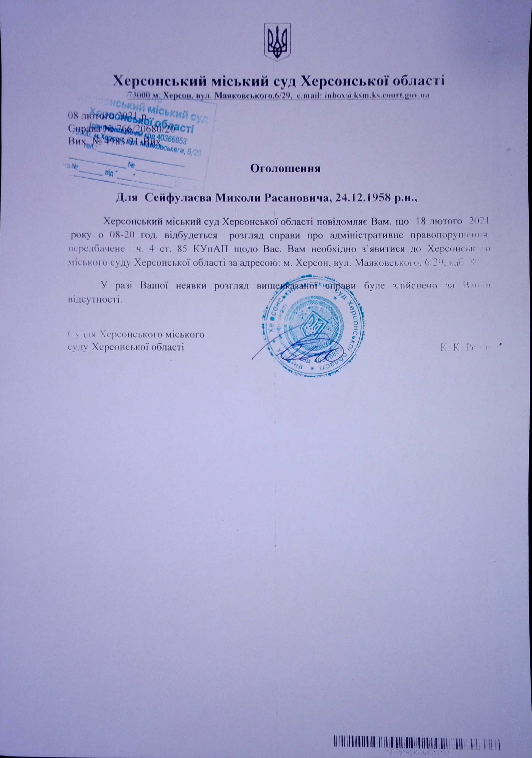ОГОЛОШЕННЯ для Сейфулаєва Миколи Расановича