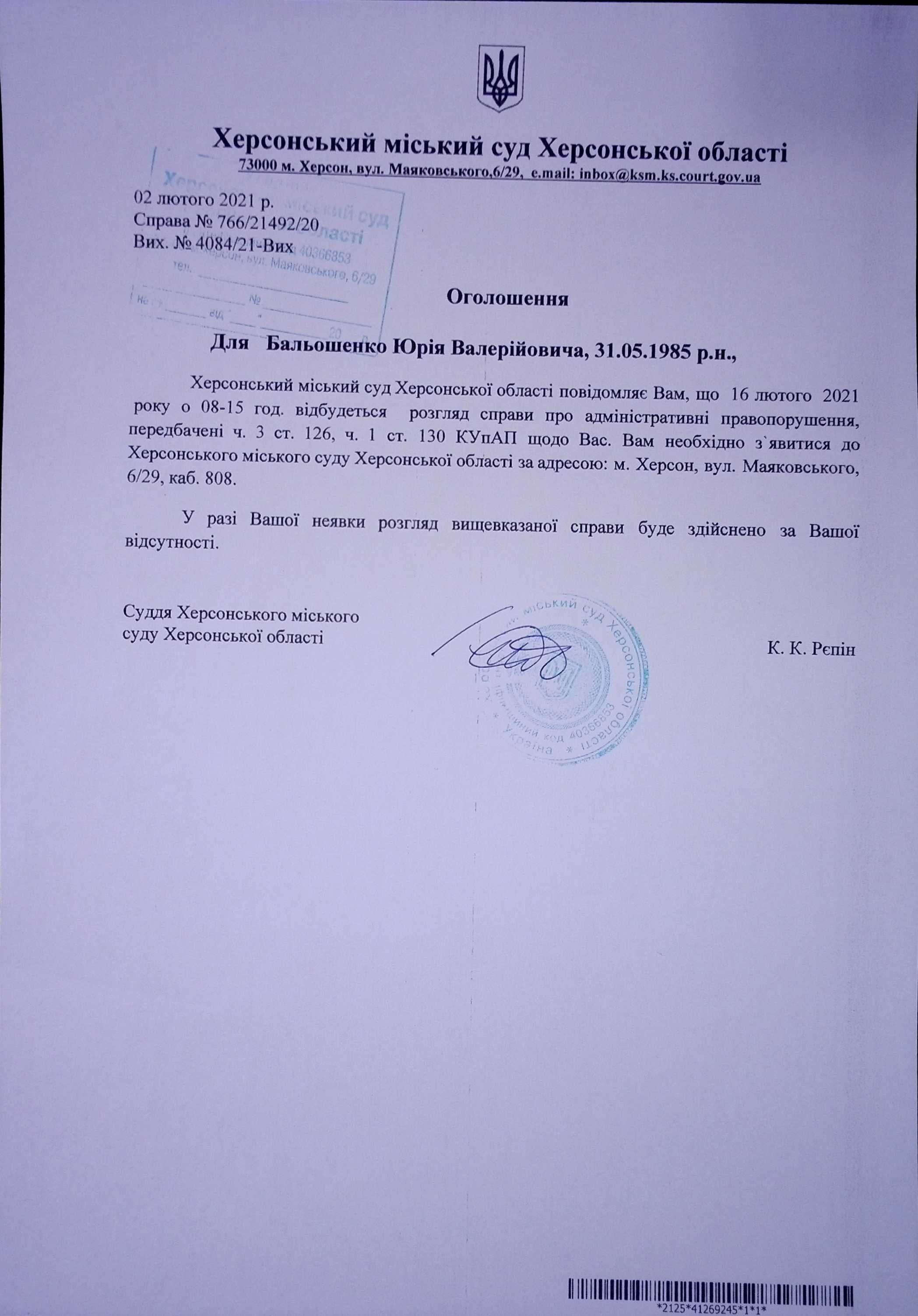 ОГОЛОШЕННЯ для Бальошенко Юрія Валерійовича