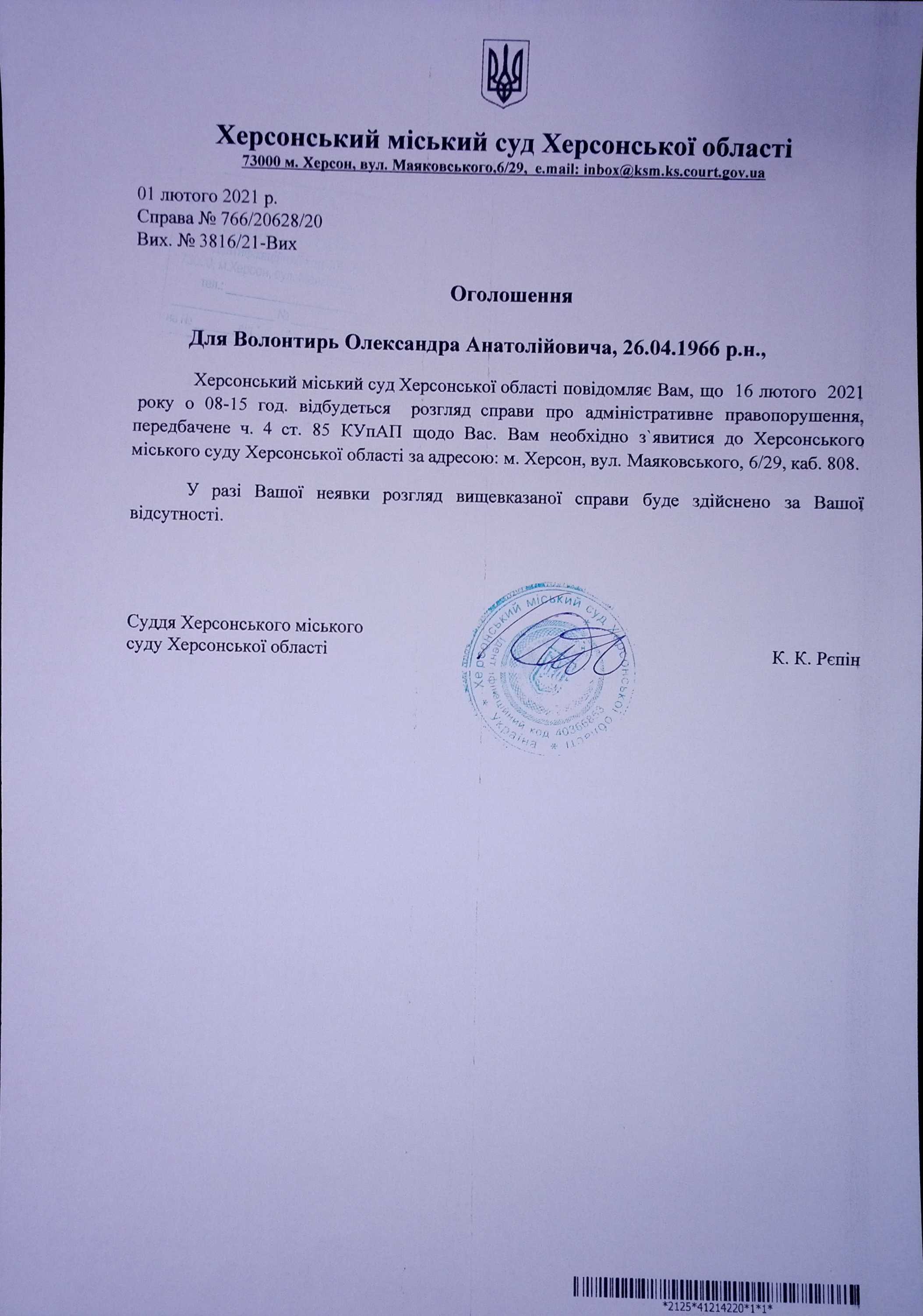 ОГОЛОШЕННЯ ПРО ВИКЛИК ДО СУДУ