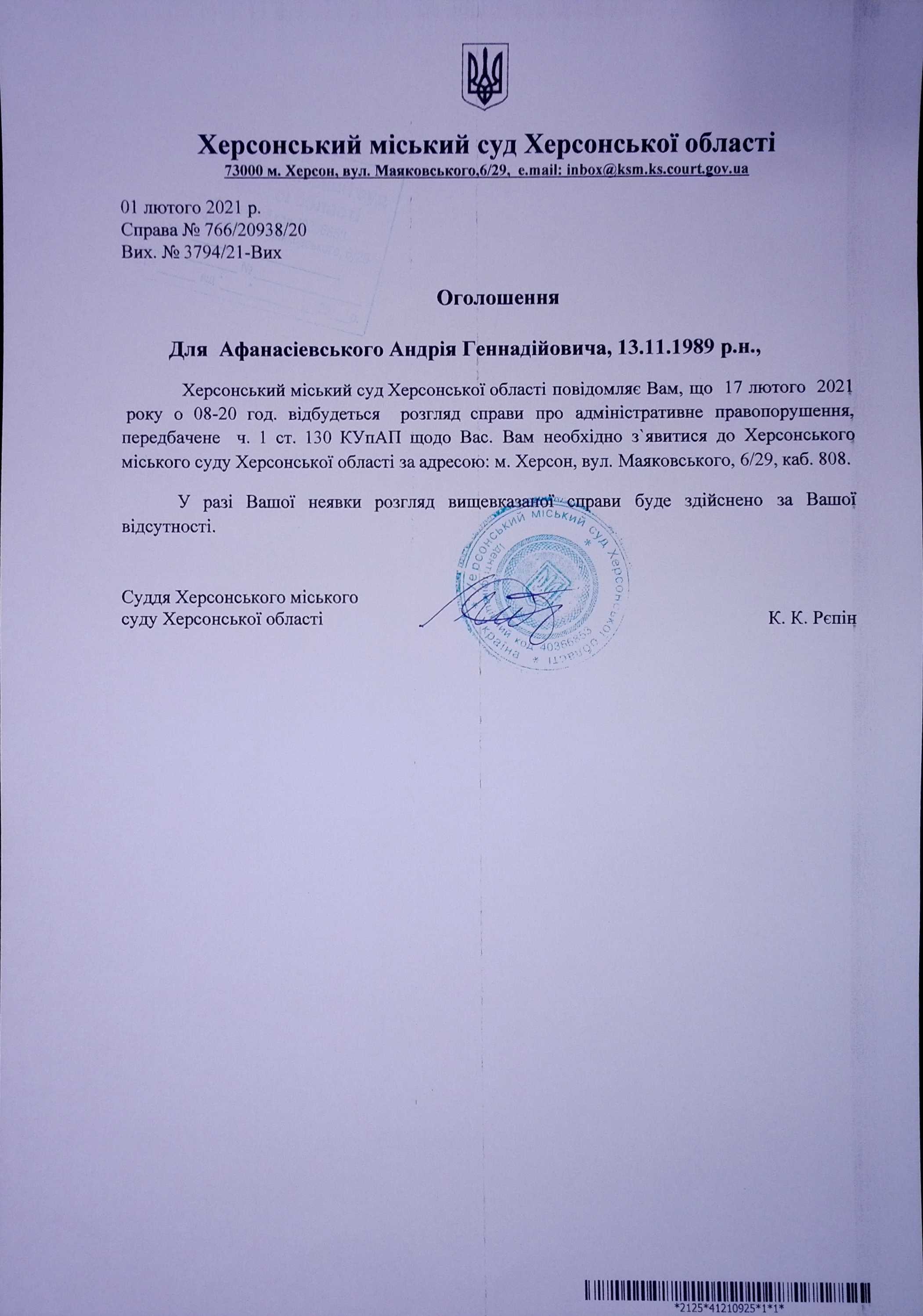 ОГОЛОШЕННЯ для Афанасієвського Андрія Геннадійовича