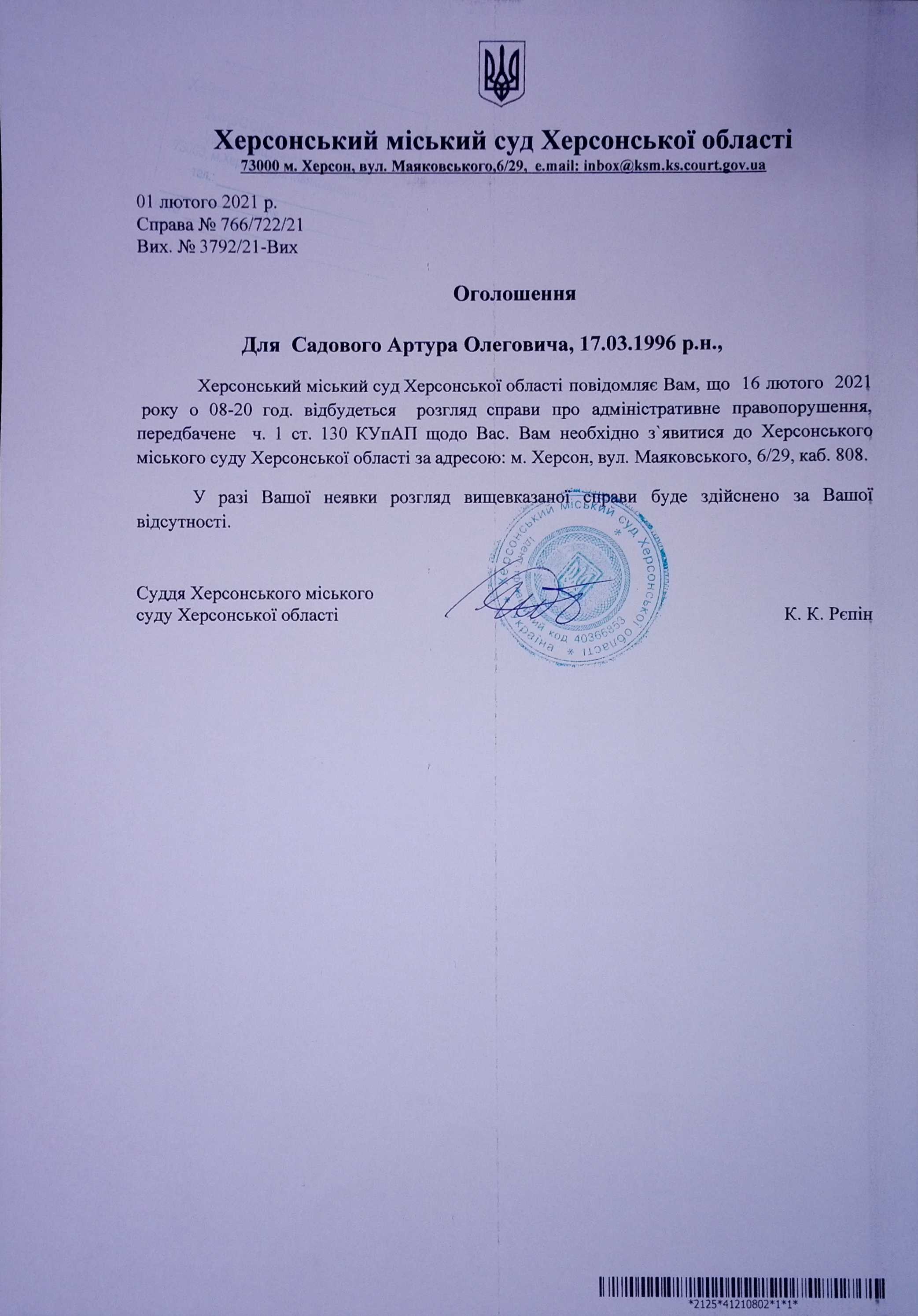 ОГОЛОШЕННЯ для Садового Артура Олеговича