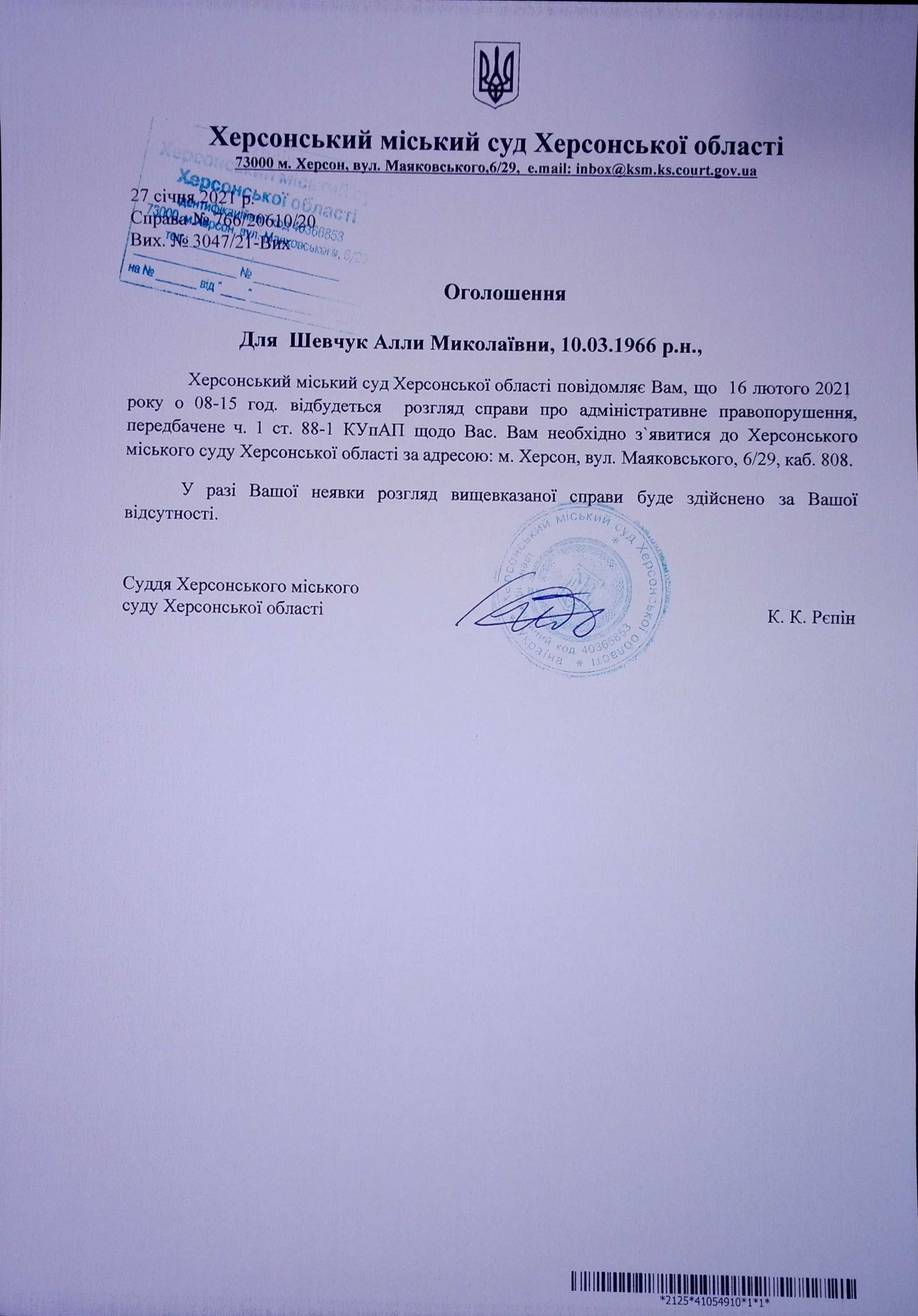 ОГОЛОШЕННЯ для Шевчук Алли Миколаївни