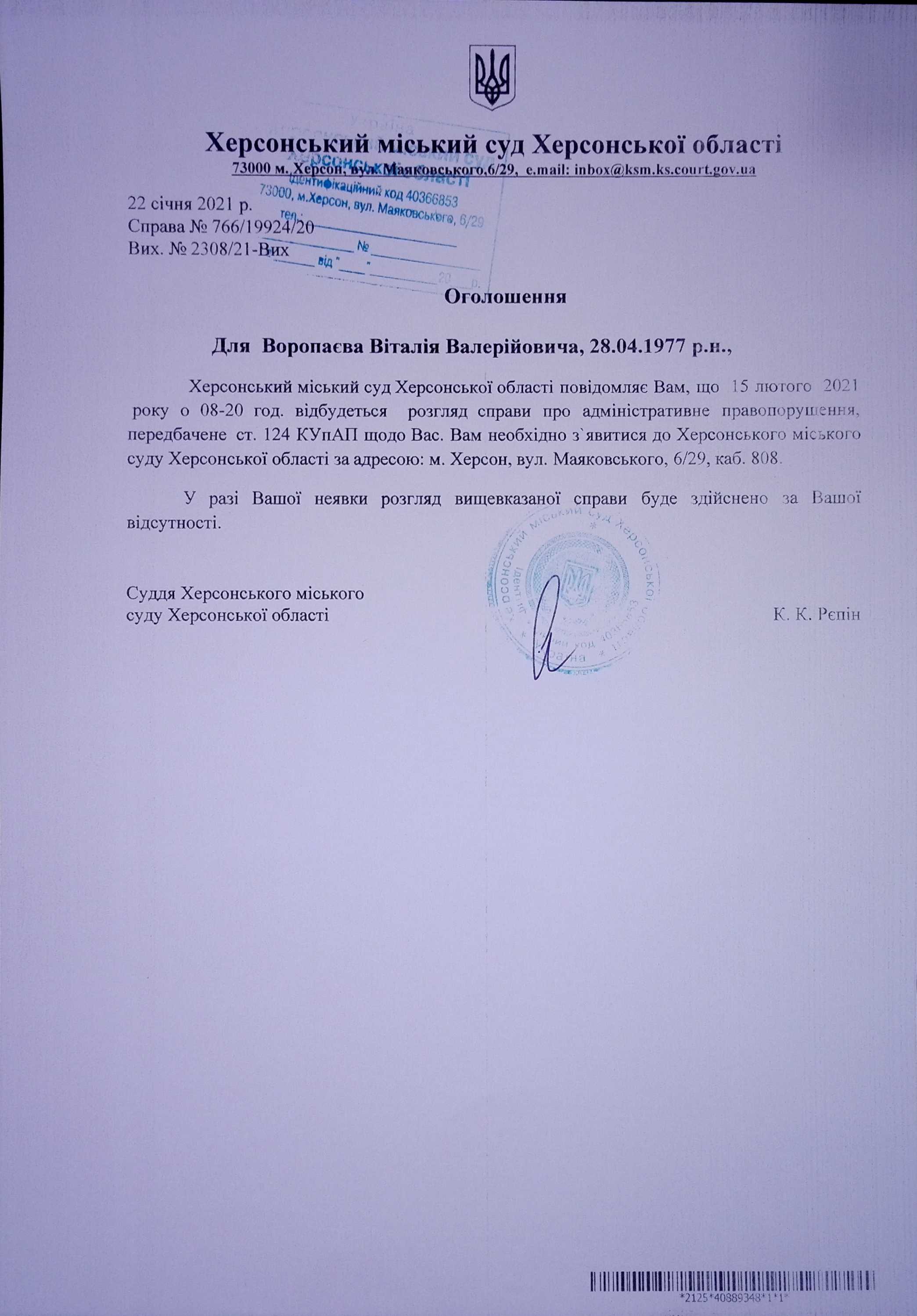 ОГОЛОШЕННЯ ПРО ВИКЛИК ДО СУДУ