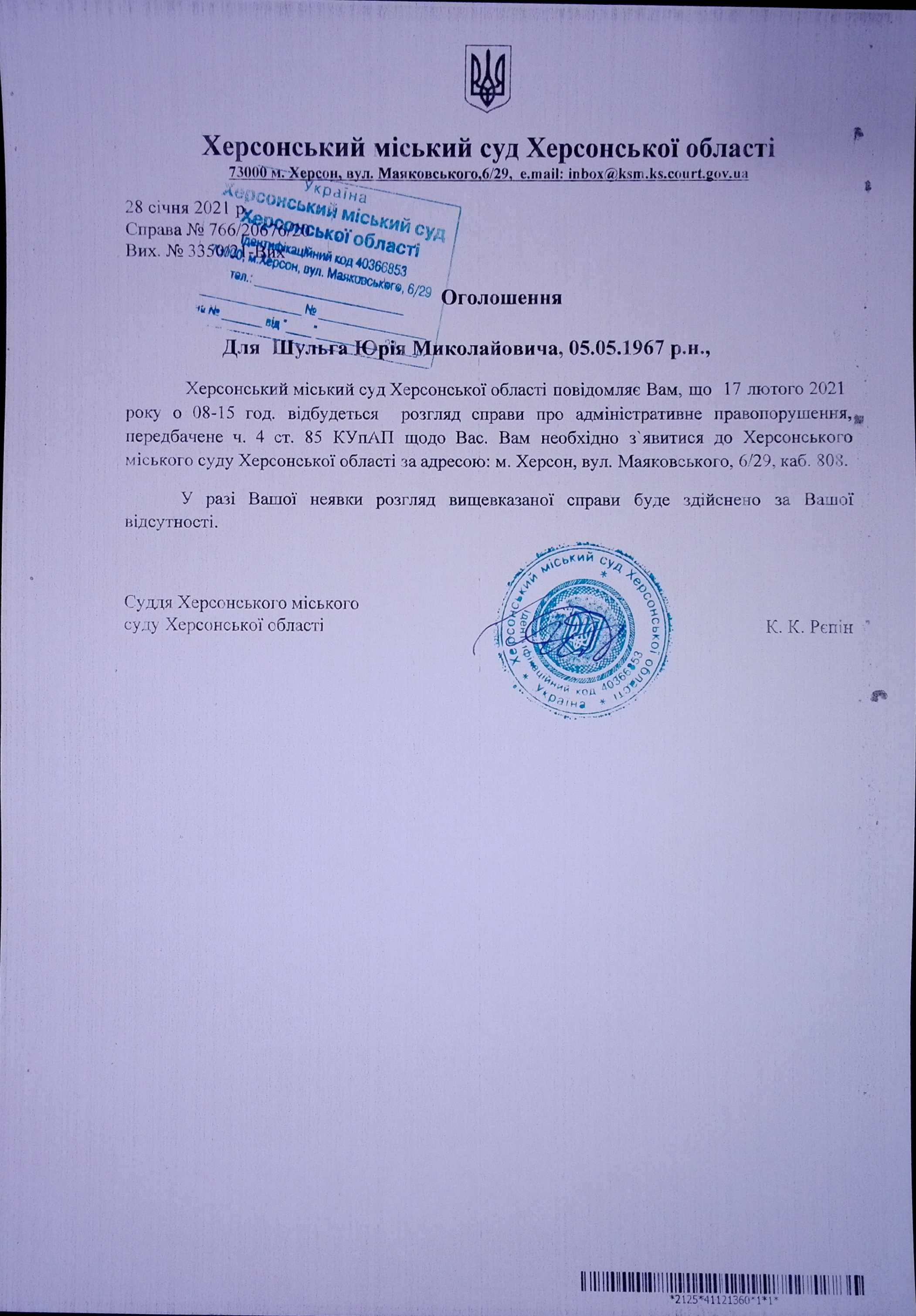 ОГОЛОШЕННЯ ПРО ВИКЛИК ДО СУДУ