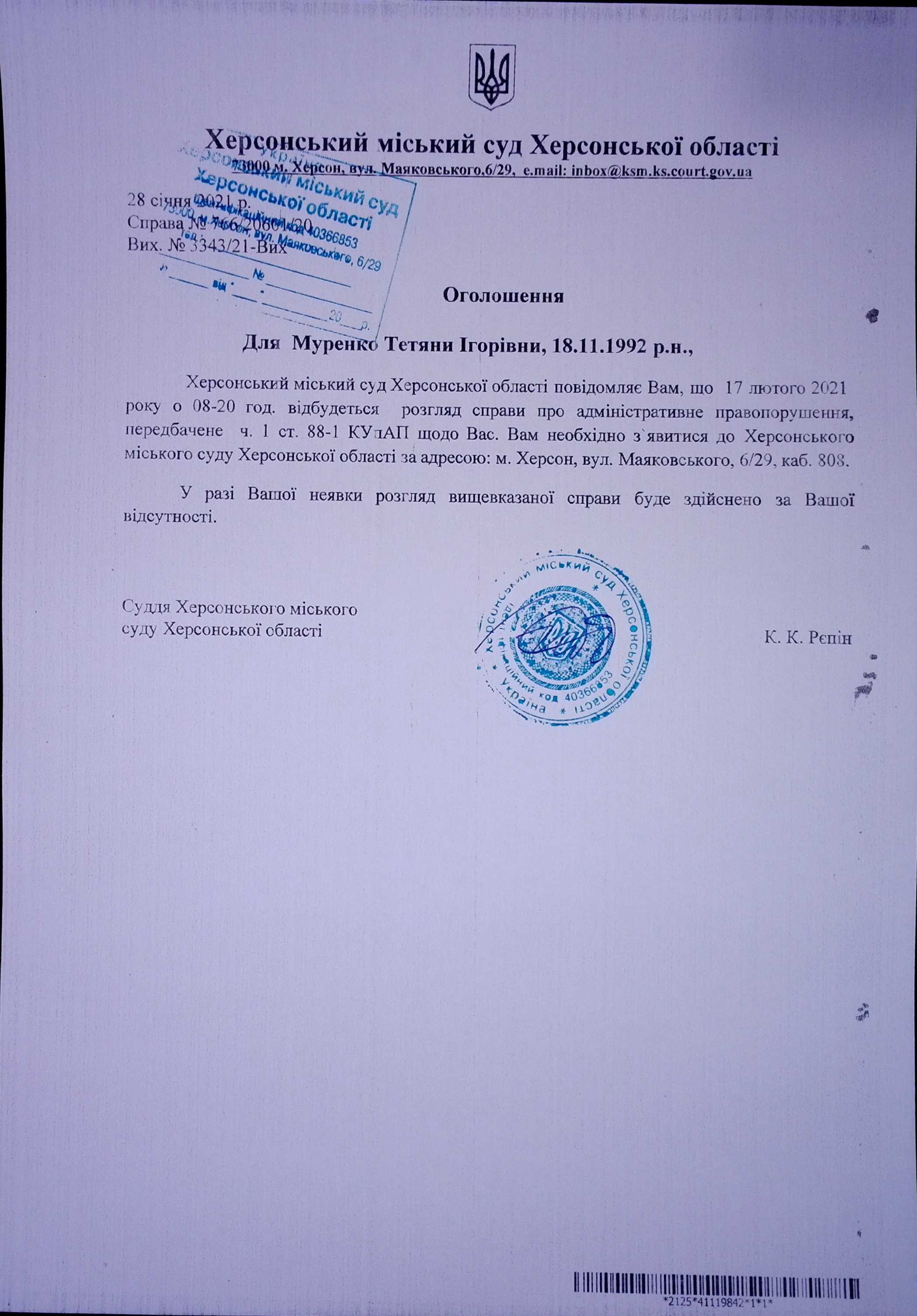 ОГОЛОШЕННЯ для Муренко Тетяни Ігорівни