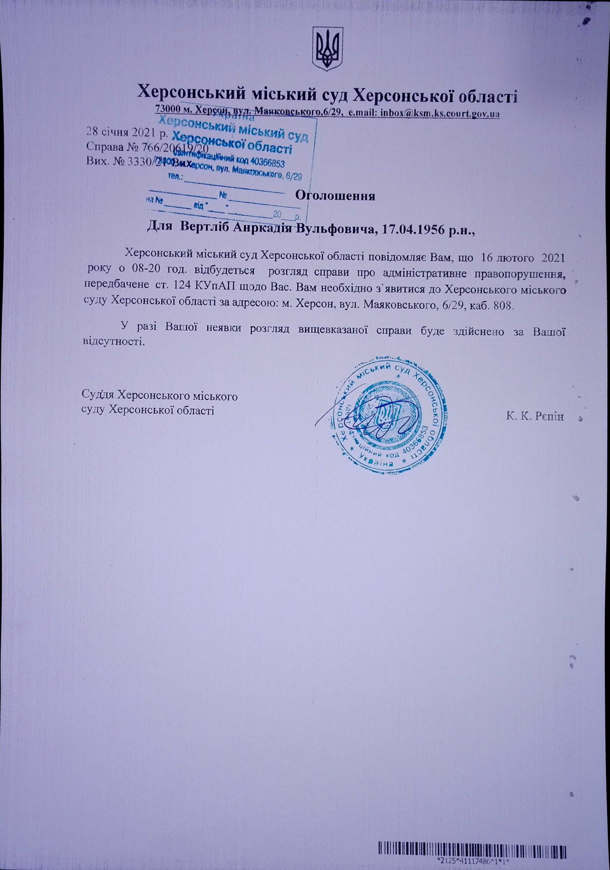 ОГОЛОШЕННЯ ПРО ВИКЛИК ДО СУДУ