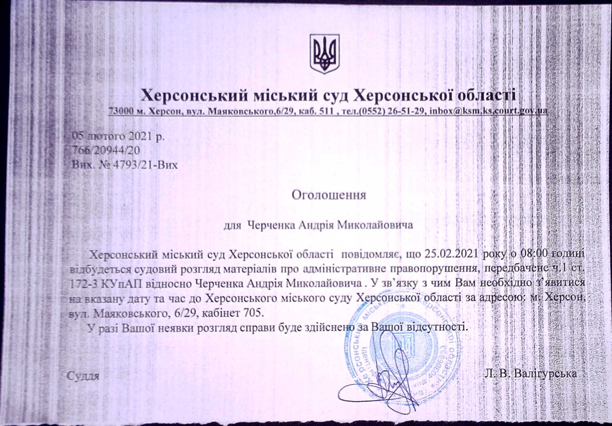 ОГОЛОШЕННЯ ПРО ВИКЛИК ДО СУДУ