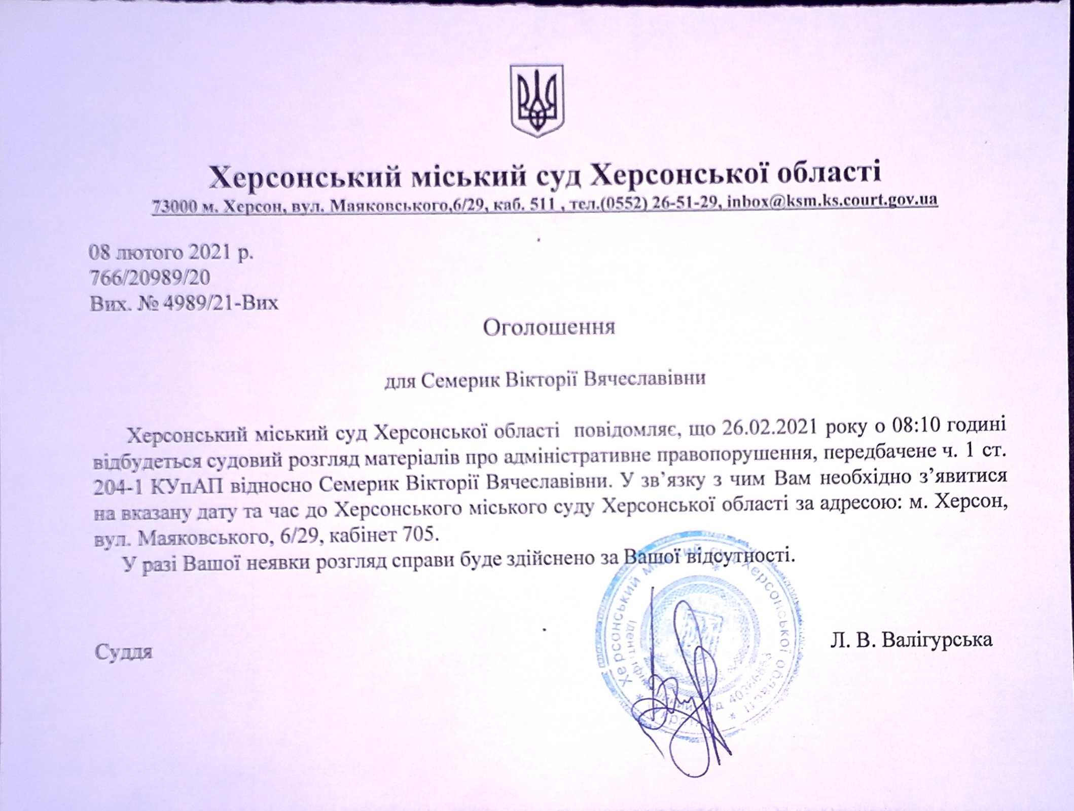 ОГОЛОШЕННЯ ПРО ВИКЛИК ДО СУДУ