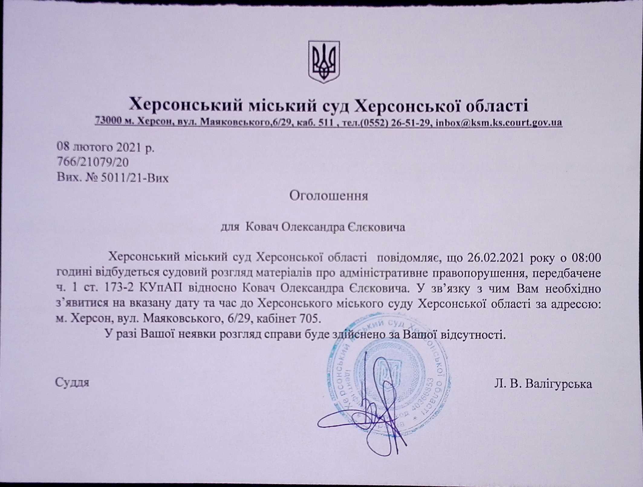 ОГОЛОШЕННЯ для Ковач Олександра Єлєковича