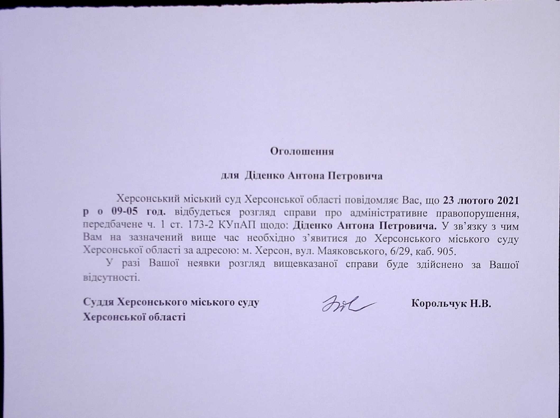ОГОЛОШЕННЯ ПРО ВИКЛИК ДО СУДУ