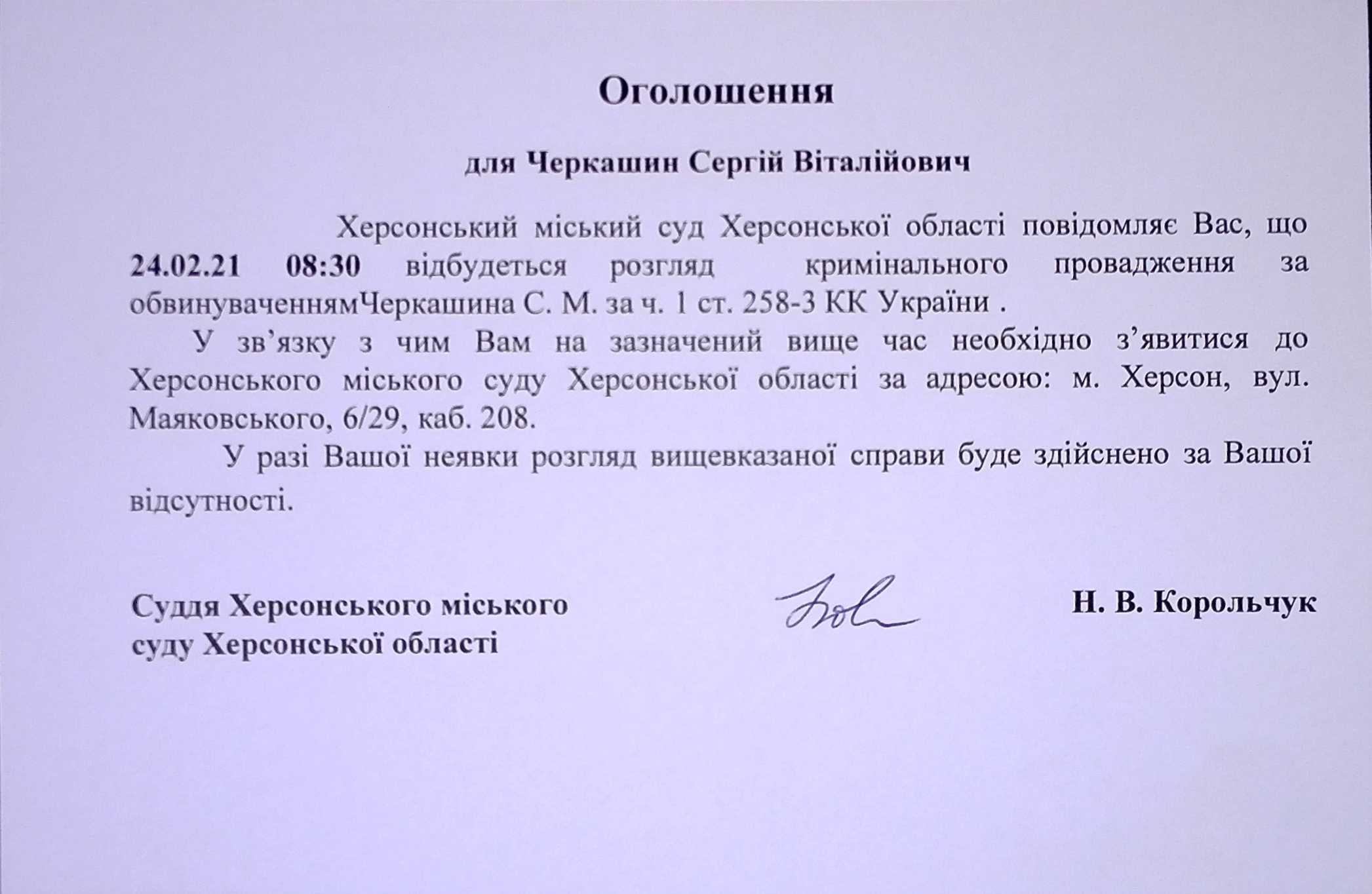 ОГОЛОШЕННЯ для Черкашина Сергія Віталійовича