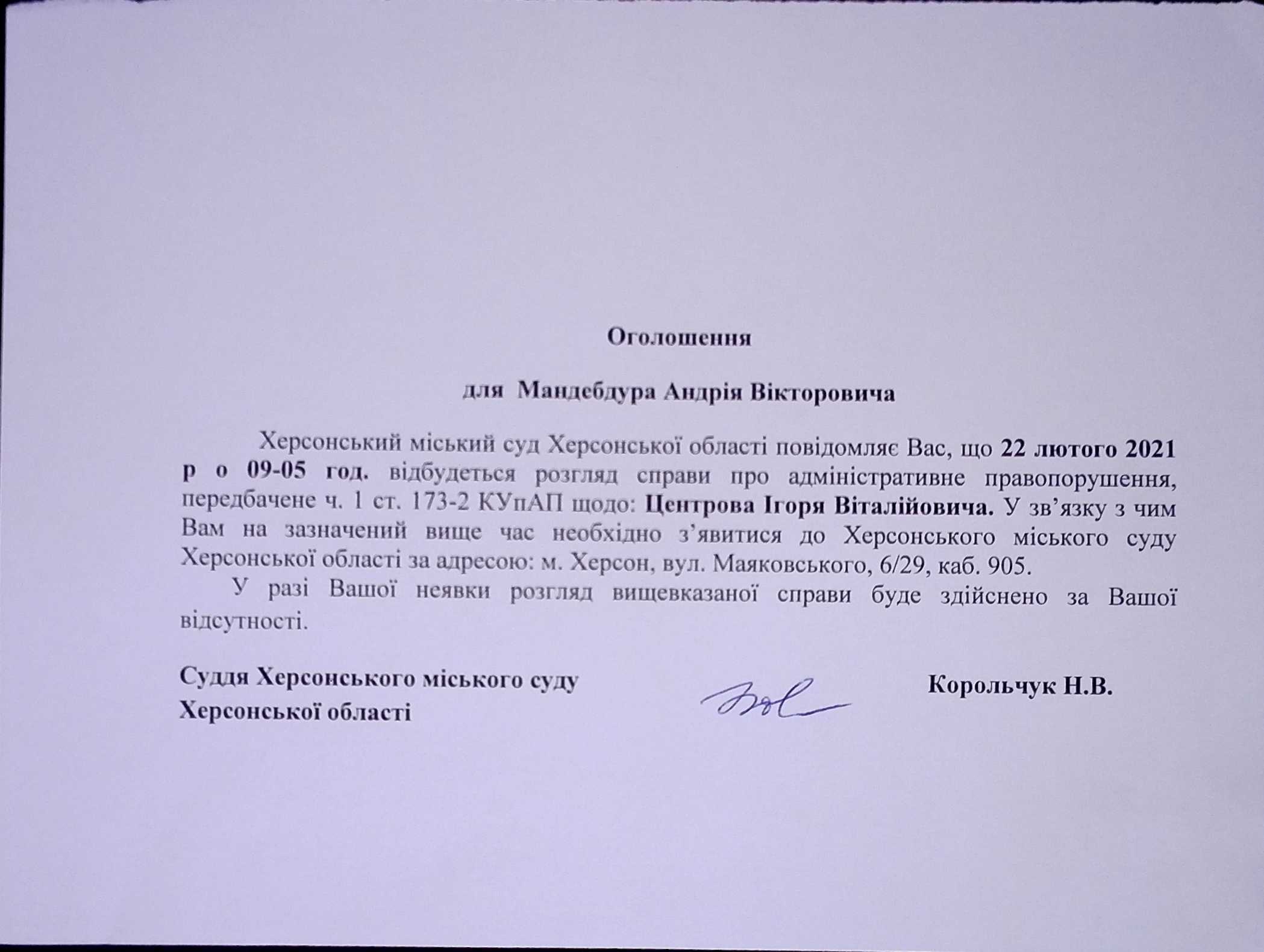 ОГОЛОШЕННЯ для Мандебури Андрія Вікторовича