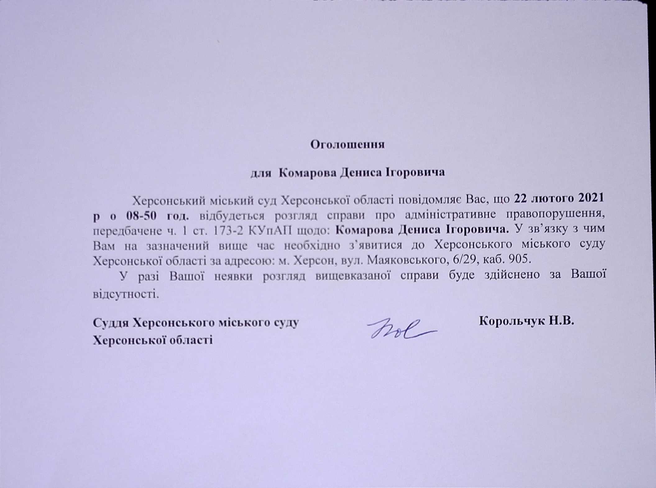 ОГОЛОШЕННЯ для Комарова Дениса Ігоровича