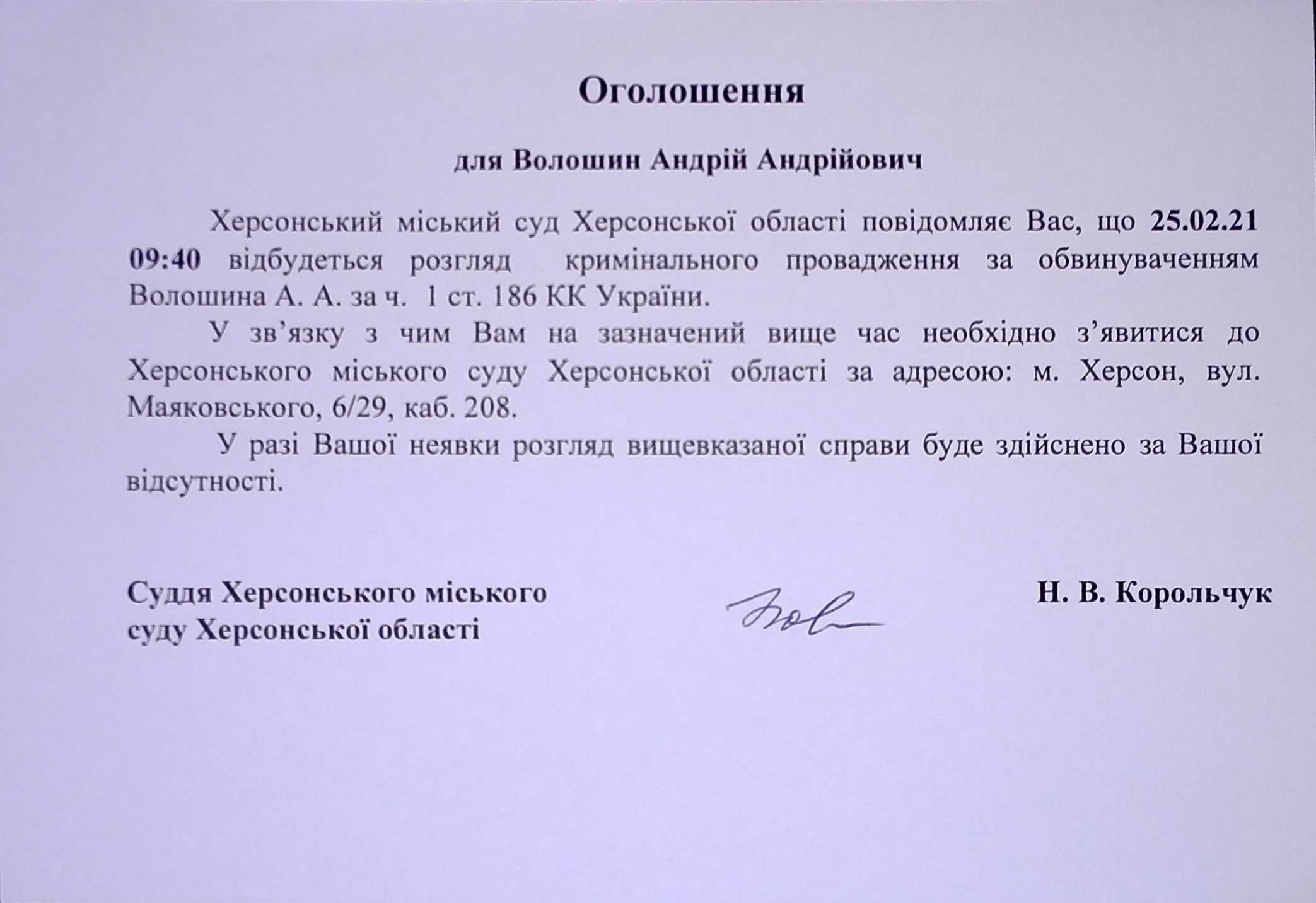 ОГОЛОШЕННЯ для Волошина Андрія Андрійовича