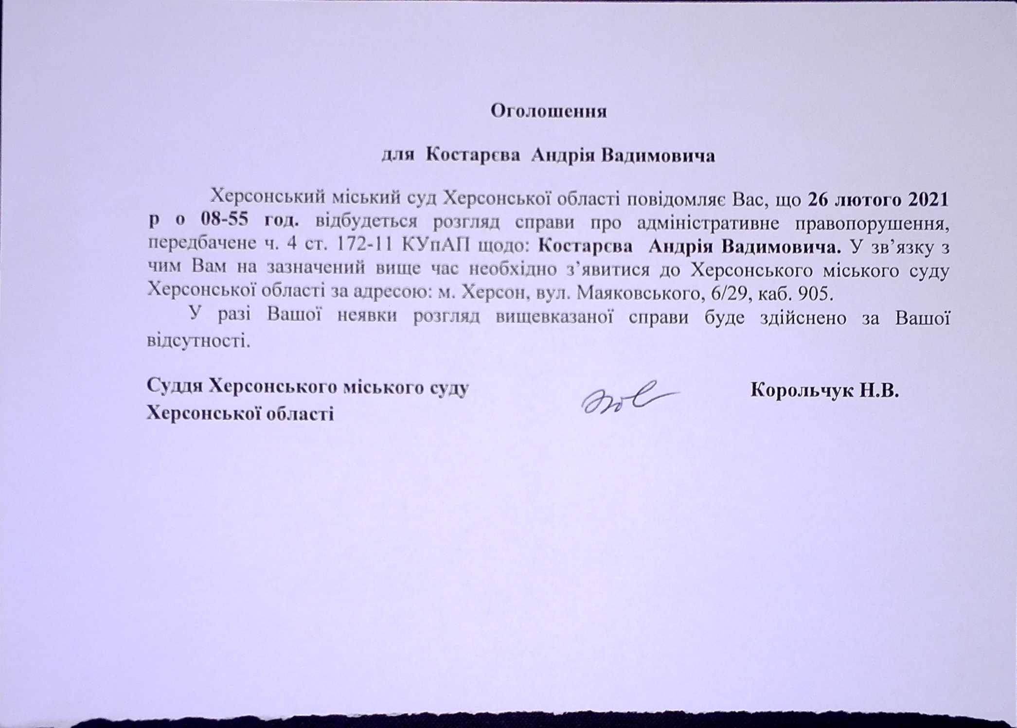 ОГОЛОШЕННЯ для Костарєва Андрія Вадимовича