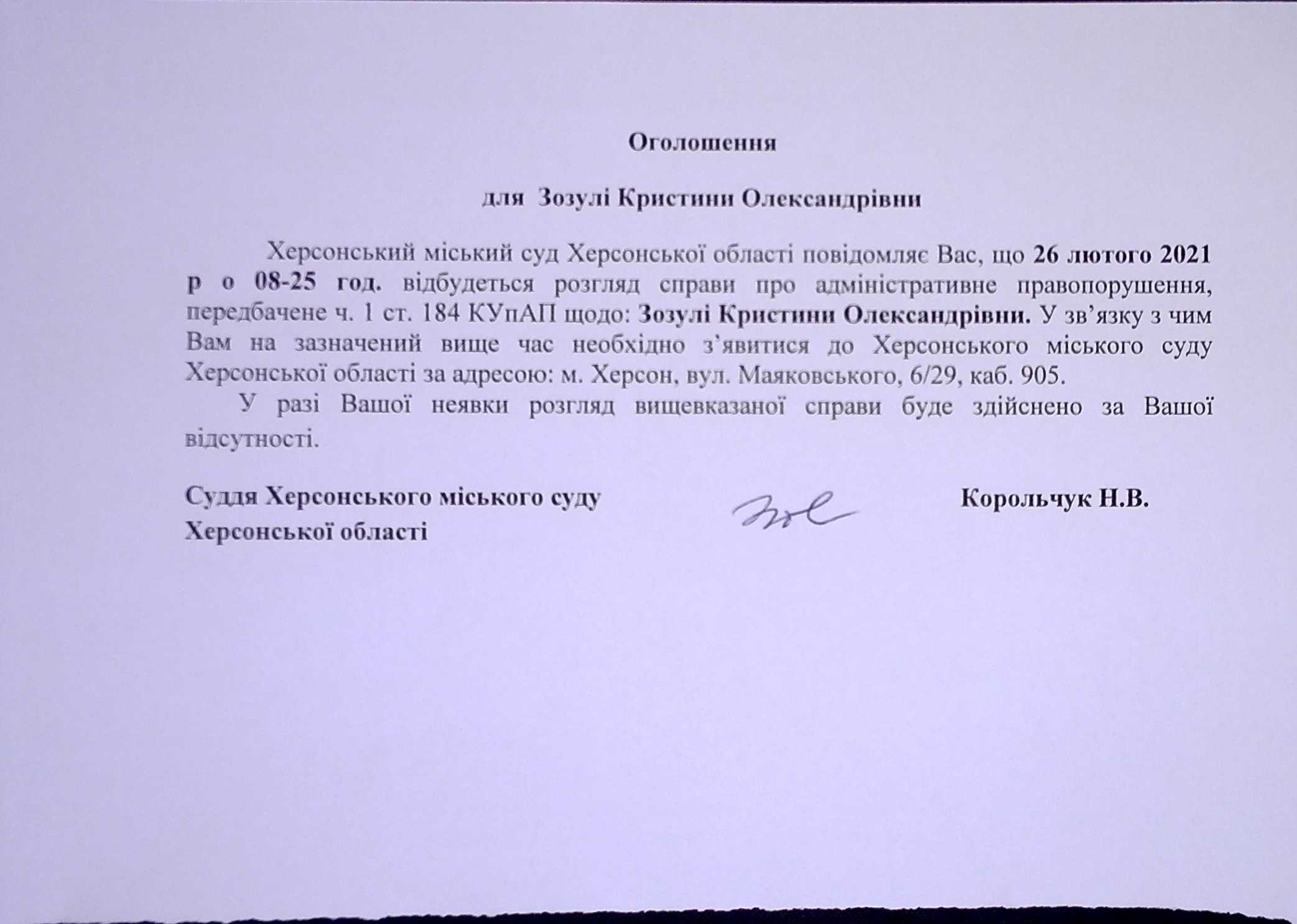 ОГОЛОШЕННЯ для Зозулі Кристини Олександрівни