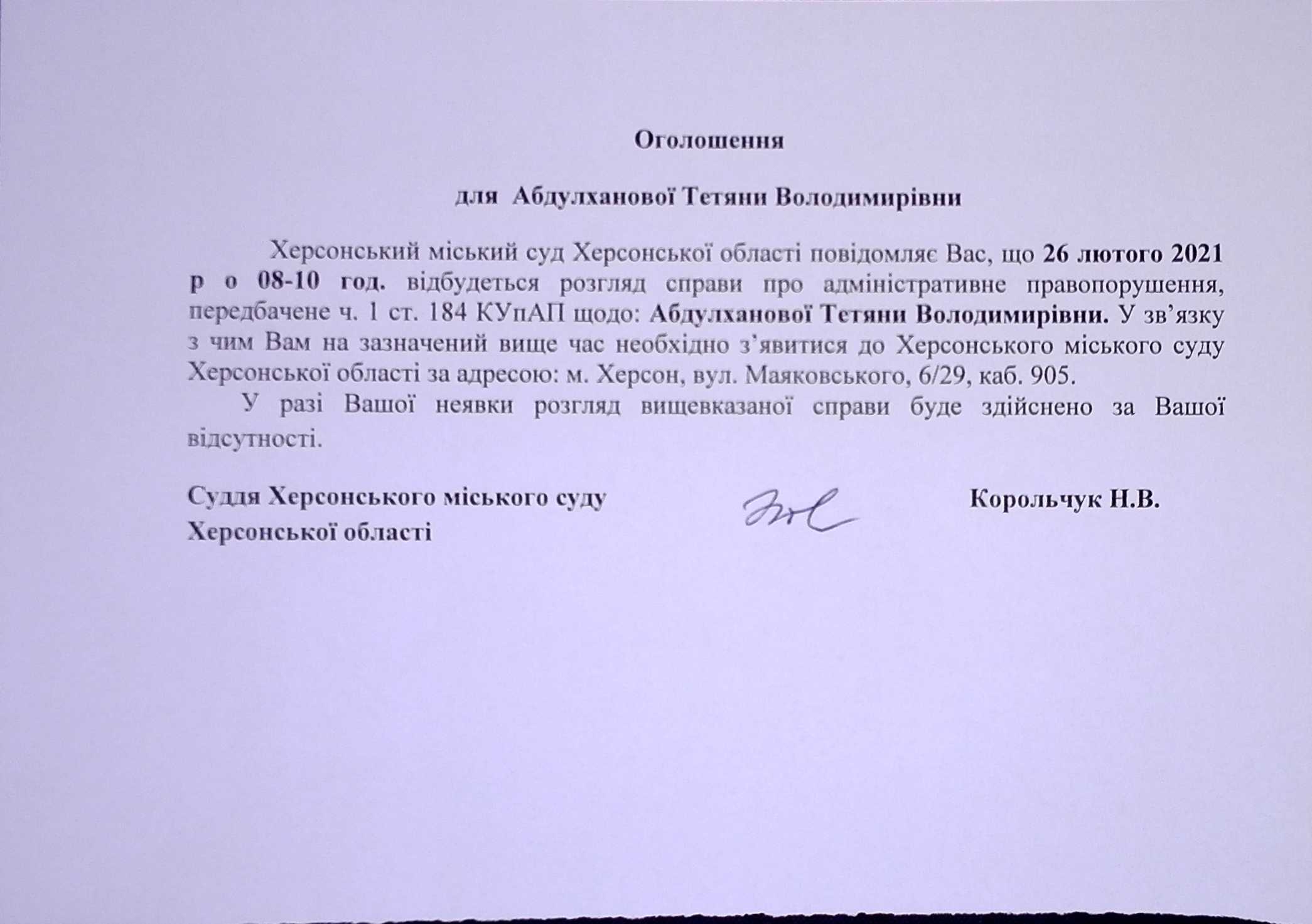 ОГОЛОШЕННЯ для Абдулханової Тетяни Володимирівни