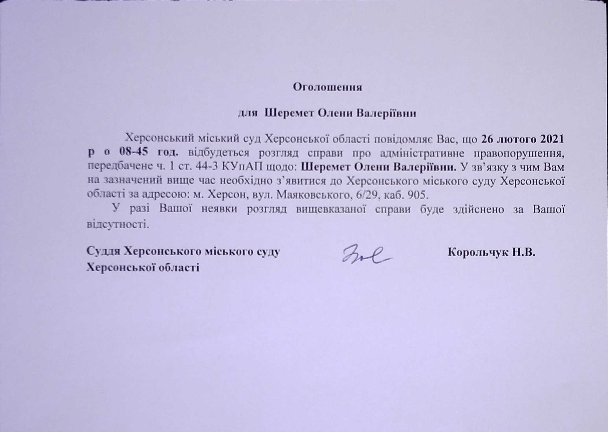 ОГОЛОШЕННЯ ПРО ВИКЛИК ДО СУДУ