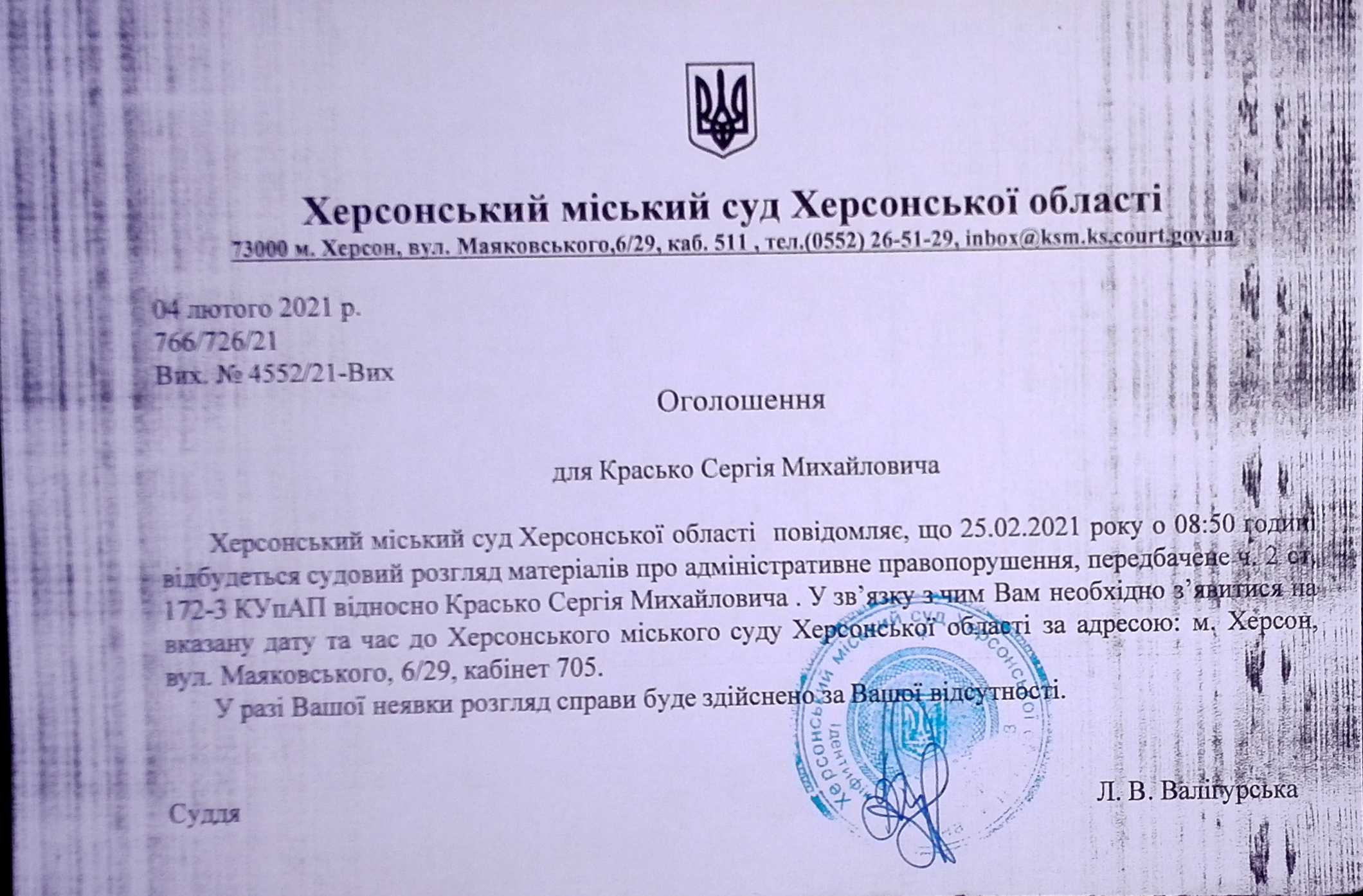 ОГОЛОШЕННЯ для Красько Сергія Михайловича