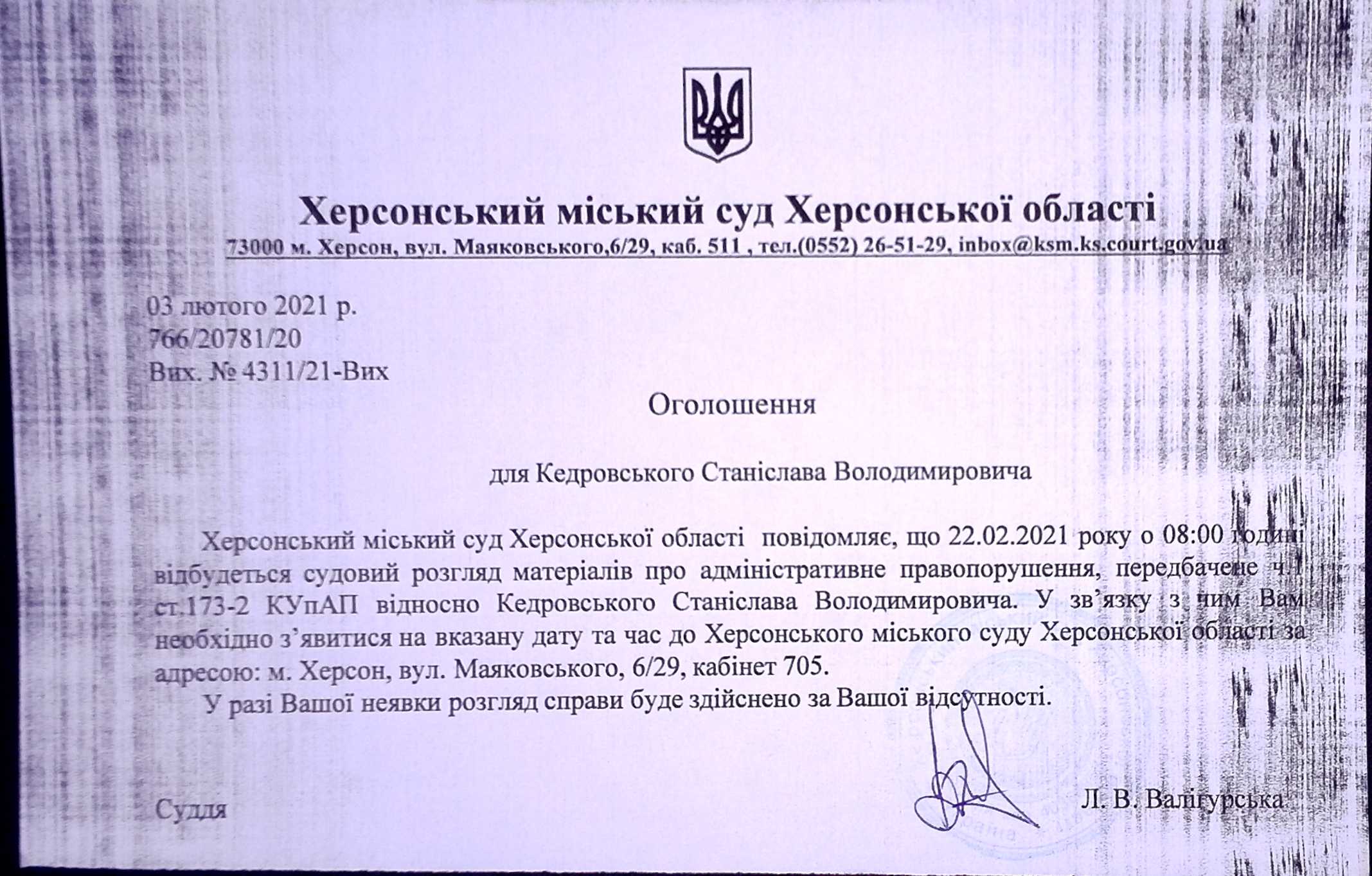 ОГОЛОШЕННЯ для Кедровського Станіслава Володимировича