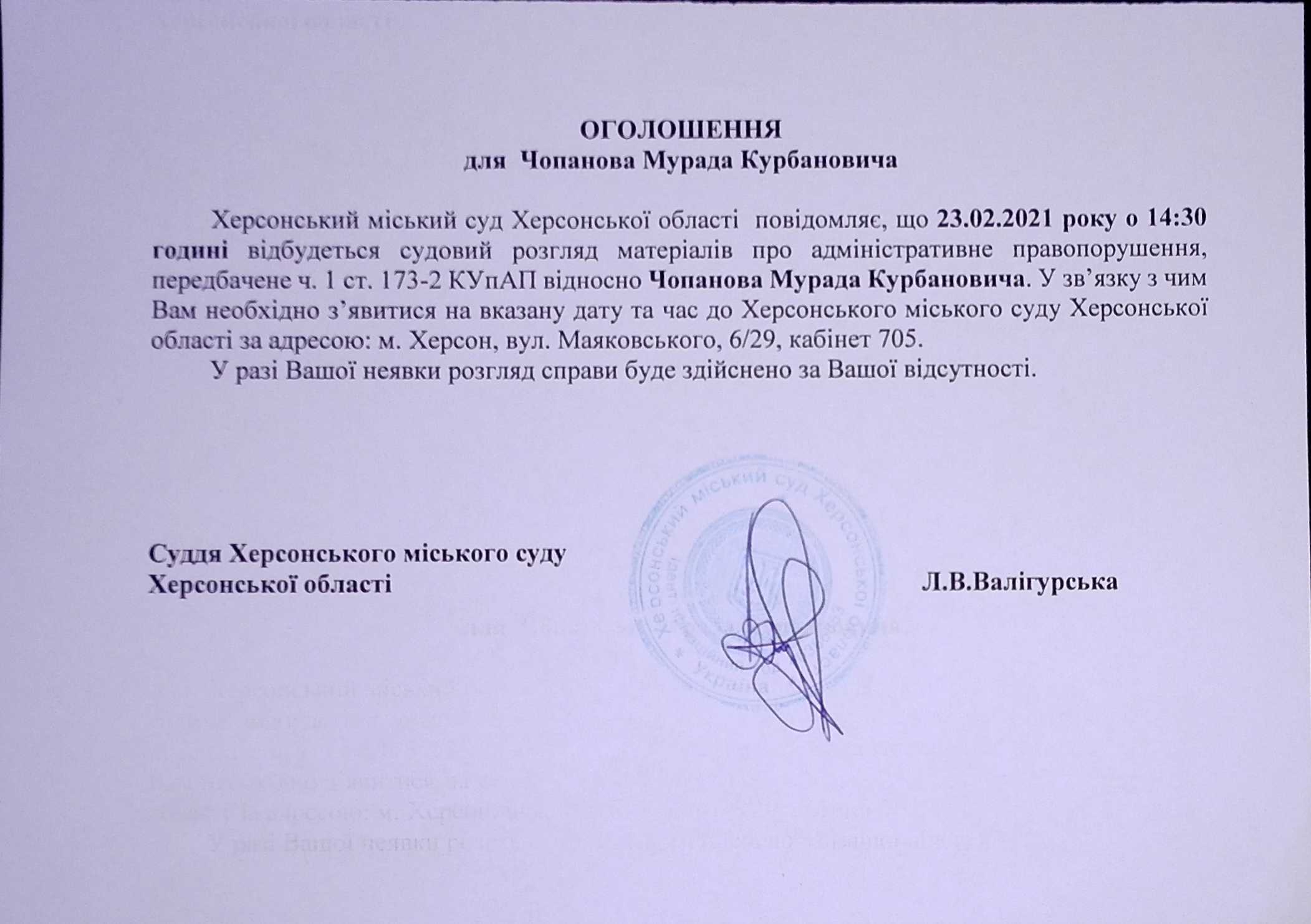 ОГОЛОШЕННЯ для Чопанова Мурада Курбановича
