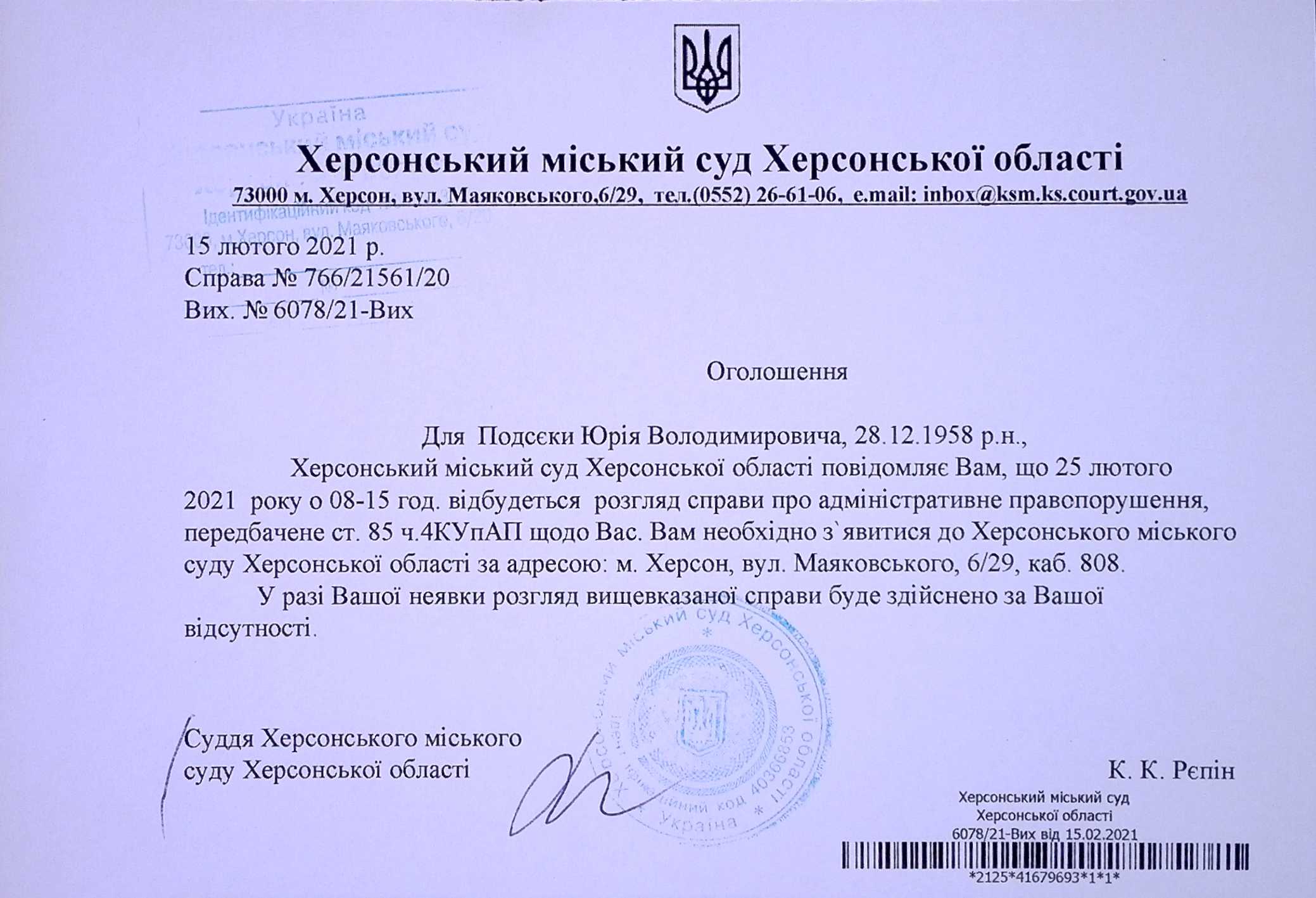 ОГОЛОШЕННЯ для Подсєки Юрія Володимировича