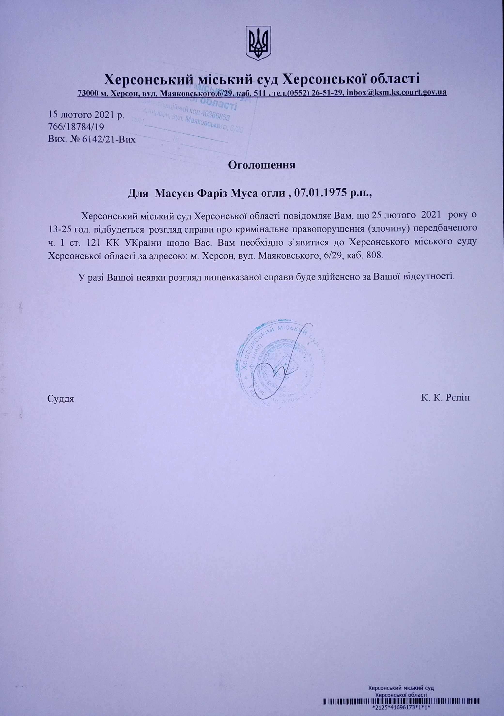 ОГОЛОШЕННЯ для Масуєва Фаріз Муса огли
