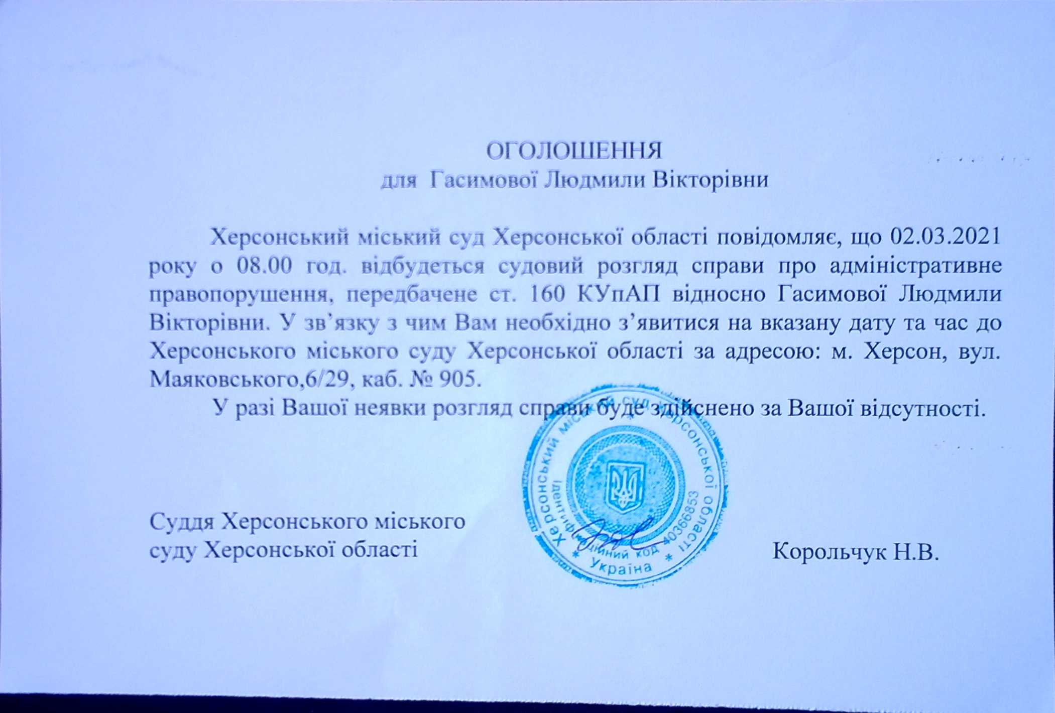 ОГОЛОШЕННЯ для Гасимової Людмили Вікторівни